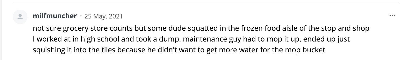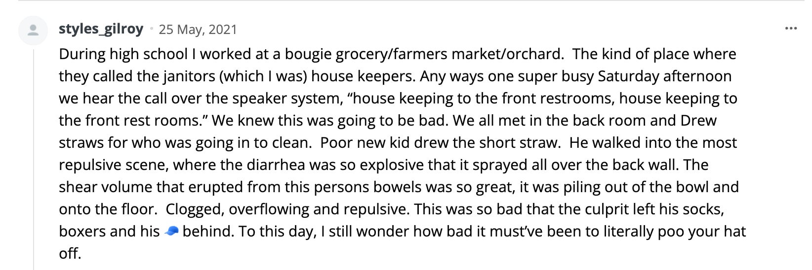 I worked at a gas station (Turkey Hill) as soon as I turned 16. The employee turn over rate was insane. By my first year, the only person employed there longer than me was my manager. One day a customer came to the register and stated that the bathroom was in need of some cleaning. Our bathroom was a just single toilet and basically the size of an indoor porta john. I went to check the bathroom and to my horror I saw something I couldn’t imagine a human being would do. Someone had a horrid amount of diarrhea. The worst part was that the individual then proceeded to toss the diarrhea all over the bathroom. I’m talking all four walls and even the ceiling. I quickly shut the door and took a moment to collect my thoughts. I then asked our new, 2 weeks of experience, 30ish single mother clerk to clean the bathroom. She left to clean the bathroom and then came storming back. She utterly refused to clean the bathroom and said she would quite and walkout if she had to clean it. I said yeah you gotta clean it. I never did see her again. Come my shift change at 11pm, my relief was a morbidly obese, cat urine stinking lady. She was so nice and polite but if I relieved her in the morning, I would have to air out the gas station due to her odor. Anyways, I told her that the bathroom needs some extra attention. She just said ok and I left for the night. After school was complete I went to work and asked my manager if the overnight chick said anything about the bathroom. My manager said nothing of note and I checked the bathroom. It looked back to normal.