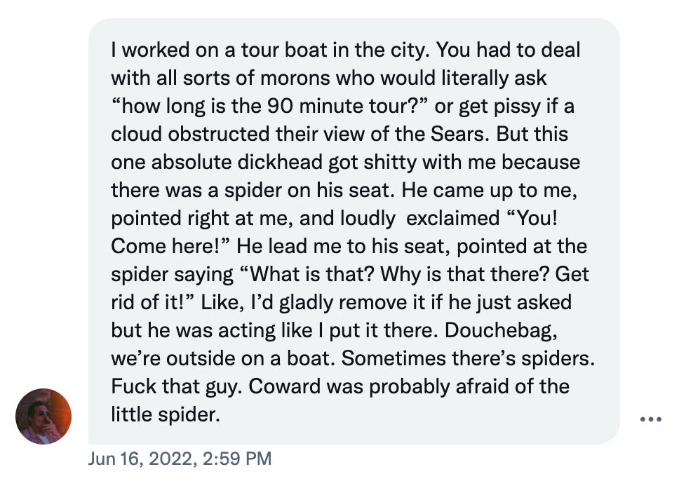 I can never understand where people get off speaking to people who have a uniform on differently than they'd speak to a regular person walking on the street. Maybe because they know the person probably won't sock them in the jaw and lose their job so they're protected? Fucking jag off.