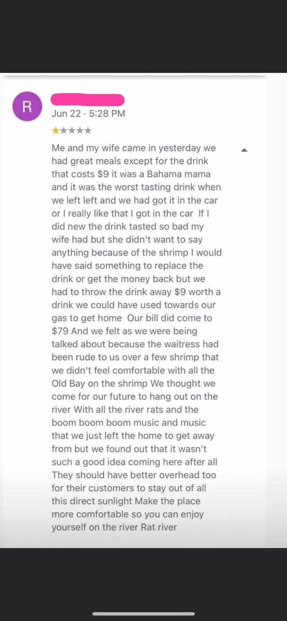 I mean I don't really even know where to start here so I'll start with apologizing for not giving the businesses name or address so everybody can partake in getting this fucked up off a $9 drink. Incredible. I'll give you a hint that it's on the "river rats river", its where "rats dressed as humans dance to boom boom boom music and music", they drink bahama mamas, and complain about old bay on shrimp.