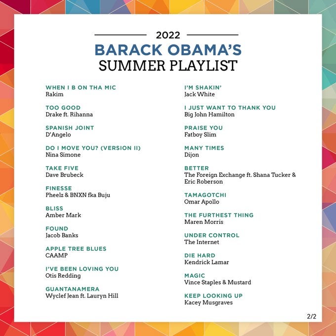His summer music playlist consists of 44 songs, some from current popular artists, including Drake and Rihanna’s “Too Good,” Tems’s “Vibe Out,” Beyoncé’s “Break My Soul,” Koffee’s “Pull Up,” Burna Boy’s “Last Last,” Kacey Musgraves’s “Keep Looking Up,” and Vince Staples and Mustard’s “Magic.”