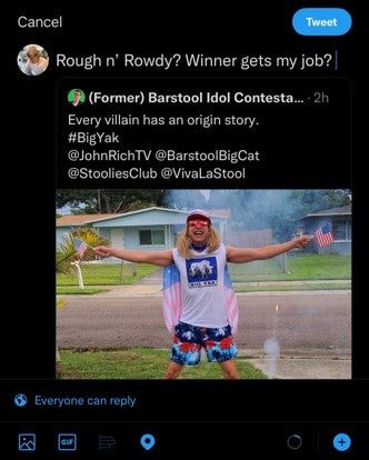 He does not work here because he lost to me in Barstool Idol. If he were to fight me in Rough n' Rowdy, he would lose again. The reason I included him on this is because soon after I officially got hired, he sent me this tweet.
