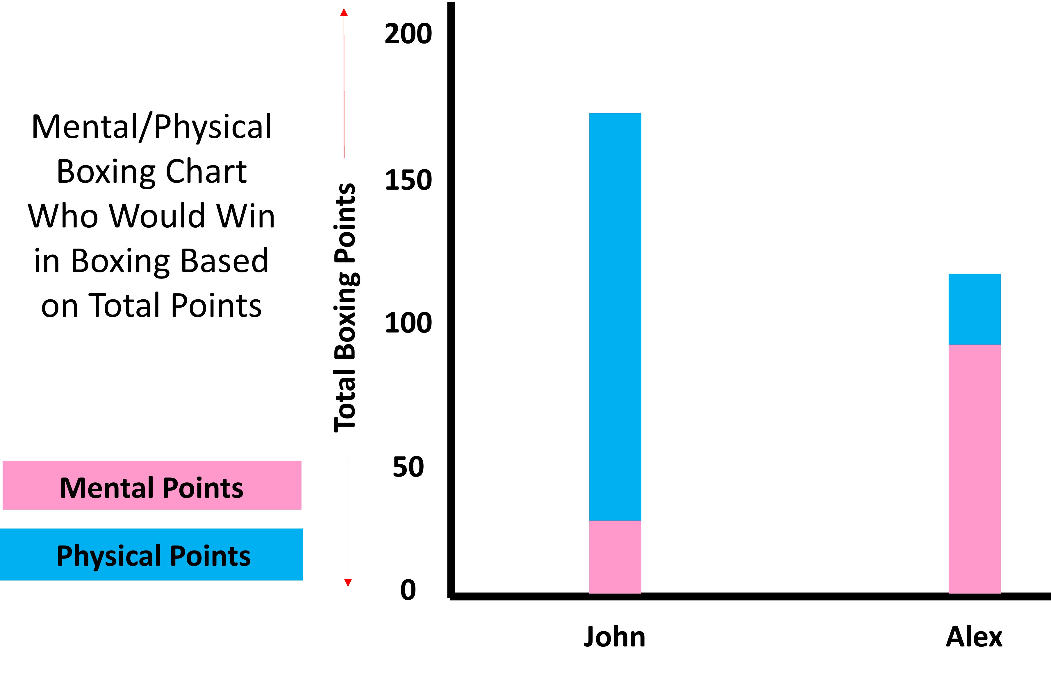 Alex will be fighting in Barstool Sports Rough n' Rowdy this month on August 18th. She has been training her ass off lately. Going to the boxing gym every morning before work is a serious commitment. She definitely knows more about boxing and strategy than I know, or ever will know. Most people think of boxing as a physical sport, but it is at least 50% mental. More physically fit men lose to less physically fit men in professional boxing all the time. It happens because they don't have good strategy. The problem that Alex would run into against me is that she is a woman. Despite everything she has learned about boxing in the past month, I would still beat her handily. Her arms are more weak than my brain is dumb. I've put together a graphic titled "Mental/Physical Boxing Chart Who Would Win in Boxing Based on Total Points" to help illustrate this. Most total boxing points = winner of the fight. You can use this chart to determine the winner of any boxing match.