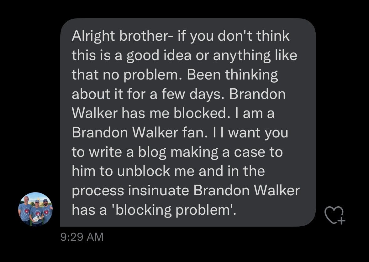 But out of all the things in the world a blog on Barstool Sports could do for Haden, the thing he wants more than anything is an unblock from Brandon Walker.