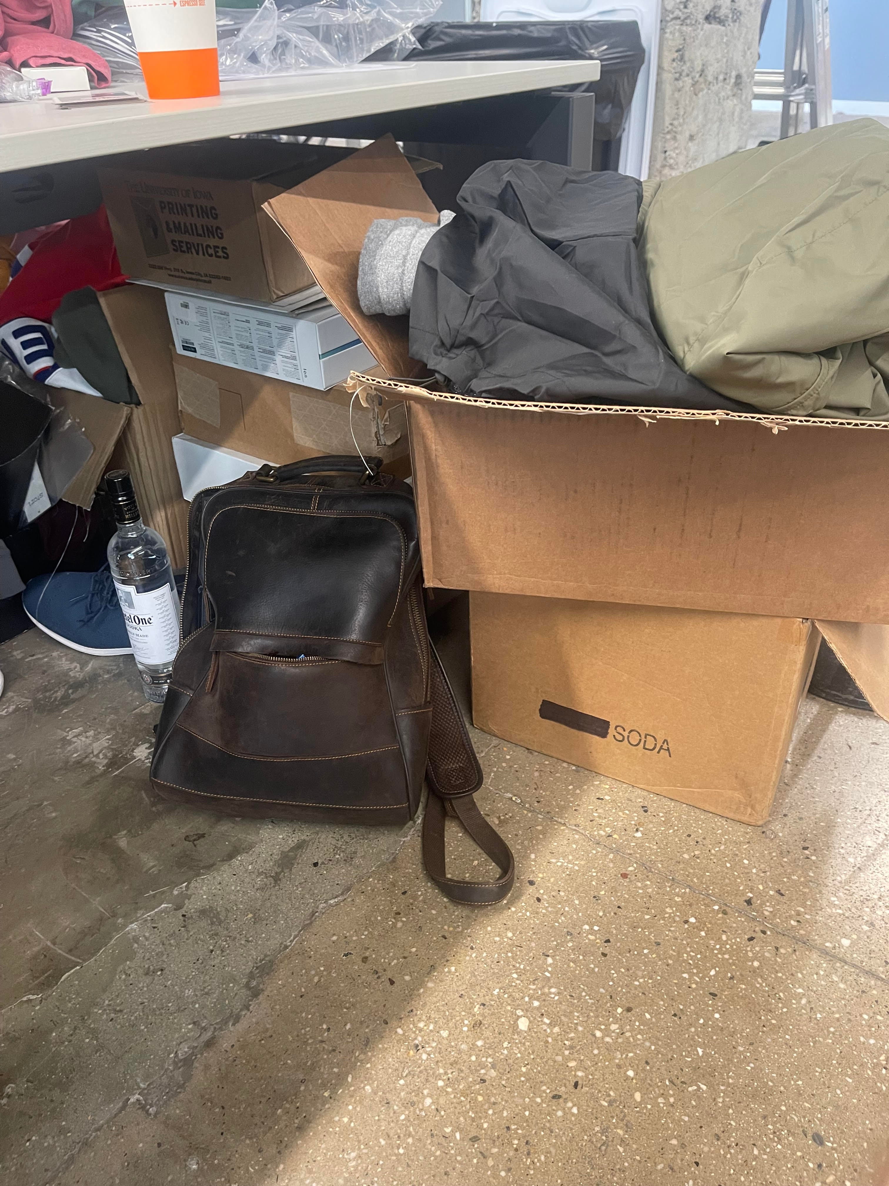 12:40pm - I need to figure out what my next drink is going to be. I want to grab a 4 Loko, but that seems difficult. 4 Loko cans are pretty difficult to conceal. I look to my left and notice some bottles on Nate's desk.
