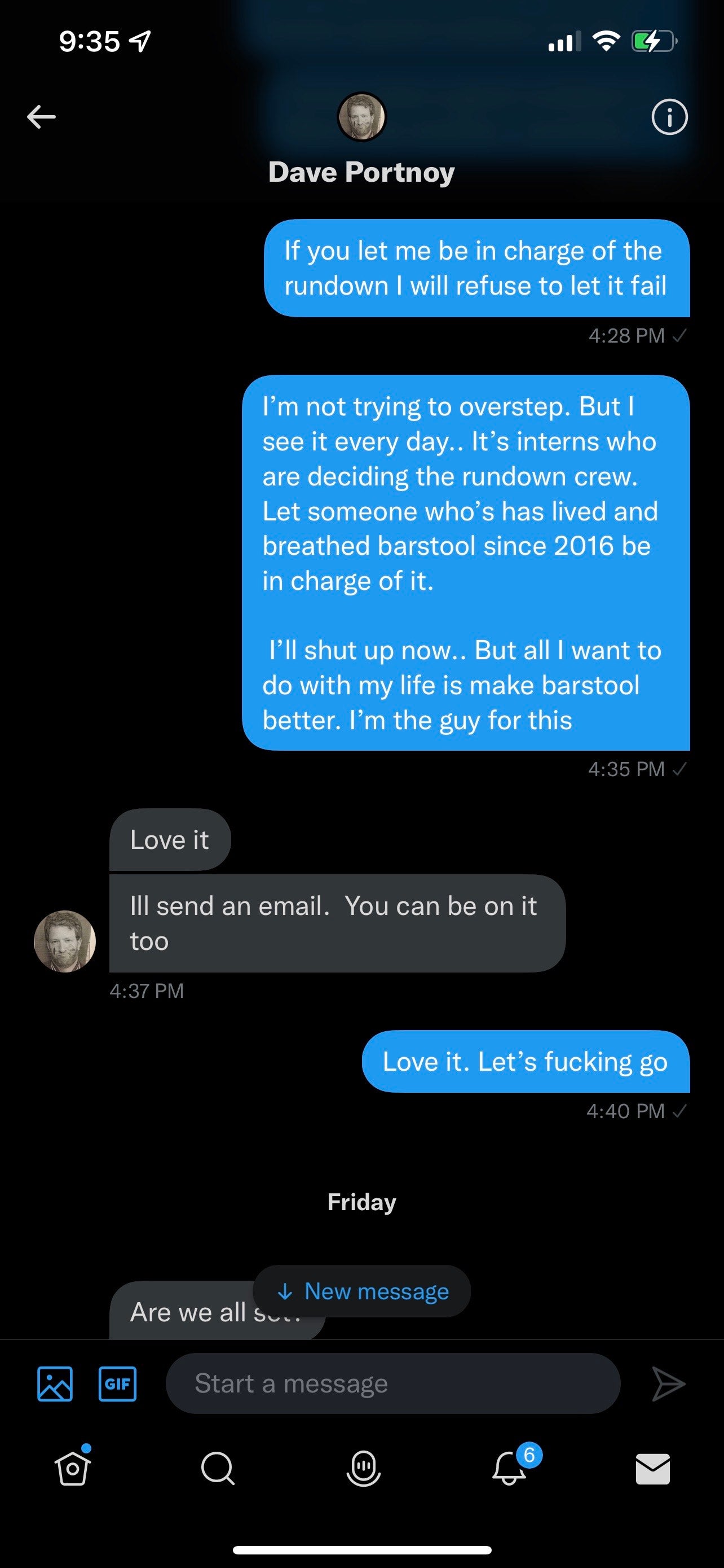 Anyways, I have been watching The Rundown on a daily basis since 2016. If anyone knows what a good Rundown crew is, it's me. Every day when The Rundown crew is selected, I can immediately tell you if people are going to like it or not. If you're a Stoolie, you probably feel the same way. So I said fuck it, I should let Dave Portnoy know this. I carefully crafted a DM and re-read it 1000 times to make sure it wasn't a bunch of drunk nonsense, then I fired this off.