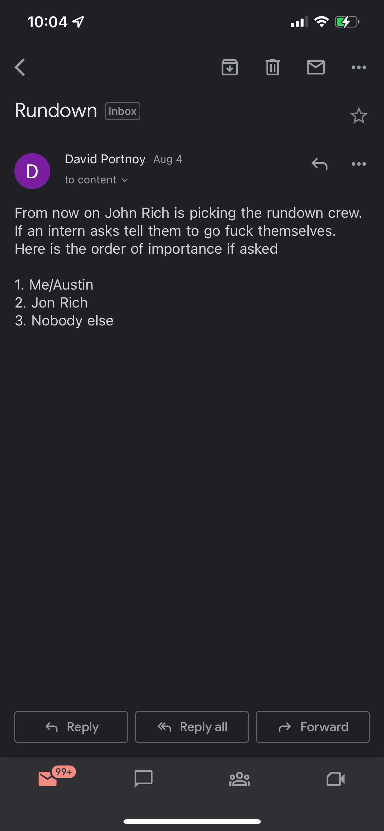 First off, round of applause to me for a remarkably coherent DM. That could have gone a lot of different ways, but I did not expect it to be that easy. I sent that DM at 4:35, Dave responded at 4:37, and at 4:38 he sent this email to every content person at Barstool.