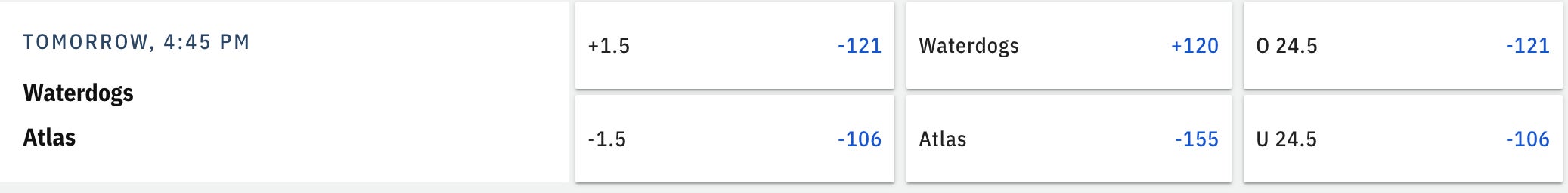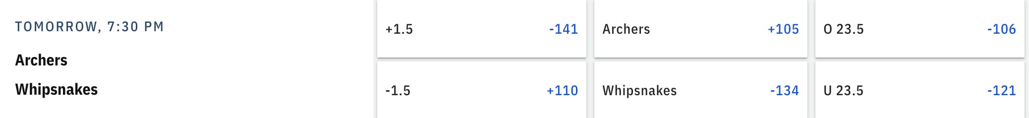 The Whipsnakes have 6 wins by a combined 9 goals. Unless they're playing the Atlas, who they just seem to completely dismantle every time they play against each other, they are addicted to winning 1-goal games. They're going to get the dub, but they're never going to blow you out of the water. So Archers +1.5 is as close to a lock as you're going to get this week, and I wouldn't count ML out of the picture either. The Whipsnakes are already locked into the playoffs. They can get into cruise control here for the final few weeks of the regular season. Archers are fighting for seeding. So if you're feeling frisky, jump on the moneyline.