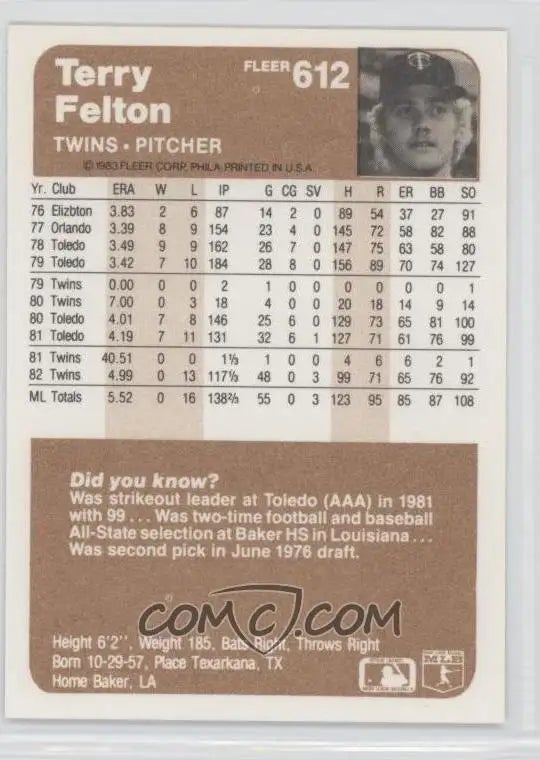The 1982 season was a new era for the Minnesota Twins, as they opened the Hubert H. Humphrey Metrodome in Minneapolis after playing at Metropolitan Stadium in Bloomington for their first 21 seasons. The Twins were a roster full of rookies and rebuilding as they suffered through their worst season since moving to Minnesota in 1961, with a record of 60-102. With the Twins giving so many young players a chance, Terry Felton finally got a full season in the majors to show he belonged. Unfortunately, things did not go well for Felton as he faltered in six starts before being sent to the bullpen.