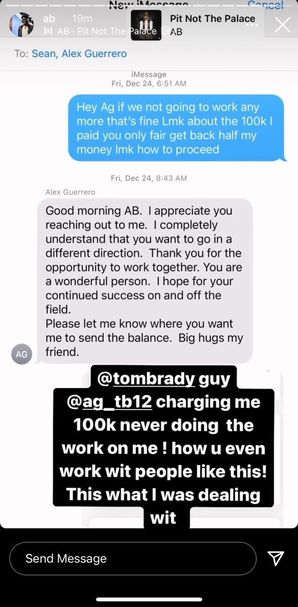 Hey Alex Guerrero. Don't allow yourself to think I've forgotten about our former arrangement and the $100,000 I am rightly owed. Because I haven't. I am of course aware of where your TB 12 Fitness store is located, and can be there to discuss this matter until it is resolved. With my attorneys, if necessary. I'd also like to point out the obvious conflict of interest involving you being on the Buccaneers payroll, while at the same time being an independent contractor, taking on Tampa players as clients in your business venture. It is also highly unethical - to say the very least - that your business partner is the most important person in the organization, thereby giving him the power (if not the authority) to give favorable treatment to those teammates who pay such exorbitant fees for your services. Creating a situation where they feel pressured to pay these usury costs, otherwise risk being marginalized, demoted, or outright released in favor of a competing player who does join. On behalf of both myself and the rest of the team writ large, this is an outrage. And I demand to be fairly compensated. Good day to you, sir.