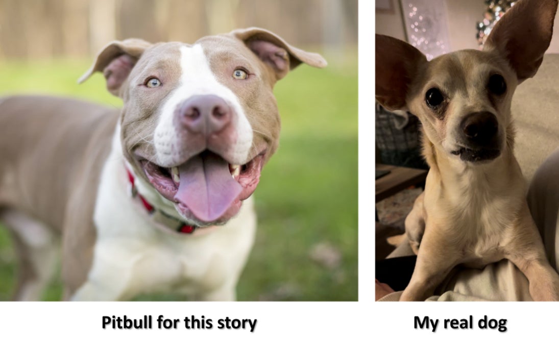I don't respond right away. My dog hops out of the car. In real life I have a small Chihuahua, but in this imaginary situation I have an extremely well behaved Pit Bull. He is off leash and is just kind of meandering around minding his own business.