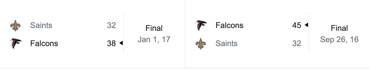 I will say, I understand that the Saints and Falcons are division foes, but it does seem pretty random that New Orleans would take a shot here. Let's check and see how the Saints fared against the Falcons in that 2016 season, when Atlanta blew that 28-3 lead in the Super Bowl...