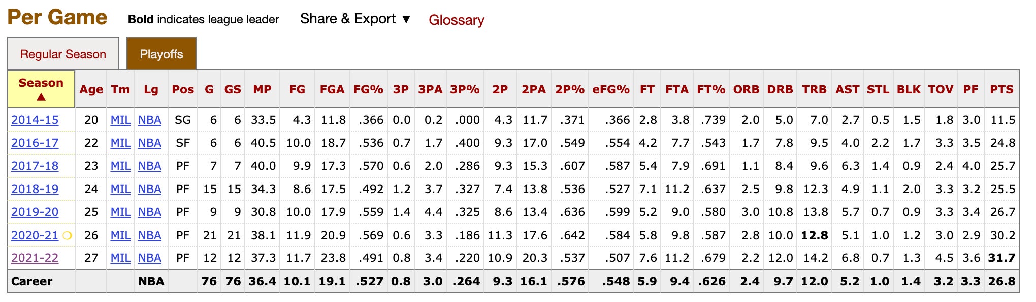 I see a whole lot of 37+ minute averages in there. The year the Bucks won the title, in those Finals Giannis played 35, 40, 37, 42, 40, and 42 minutes when he just so happened to put up one of the greatest Finals performances in league history to clinch it