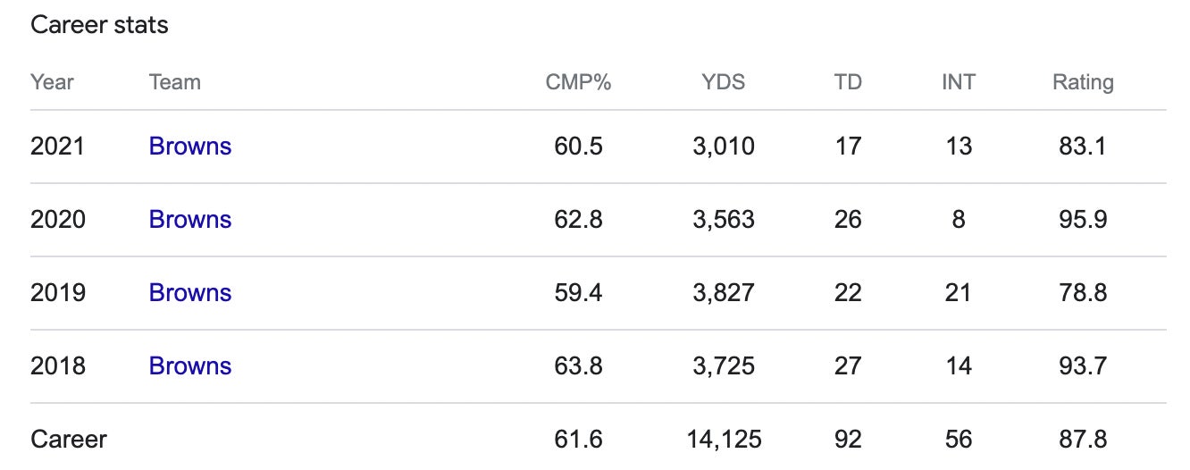 He had some good and bad years for the Browns but you guys were the worst team in the NFL. A laughing stock actually. They would give out free beer if you just won one game and then all of a sudden you got a little taste of the good life with a good quarterback. Now you basically just want nothing to do with him? Sure they've had talent surrounding him like Chubb, OBJ, Landry, but you need a good QB to make it all work the way it did. OBJ also wasn't the OBJ everyone knows, he was a problem in the locker room as well. I am not here to defend him as a top 10 quarterback but some of you morons act like him and Jalen Hurts are comparable or him and Jimmy Garoppolo. Let's also not forget how injured Baker was all last year and didn't use any excuses. He basically played with a torn shoulder the entire year and Browns fans wanted to destroy him for giving his all. Losers.