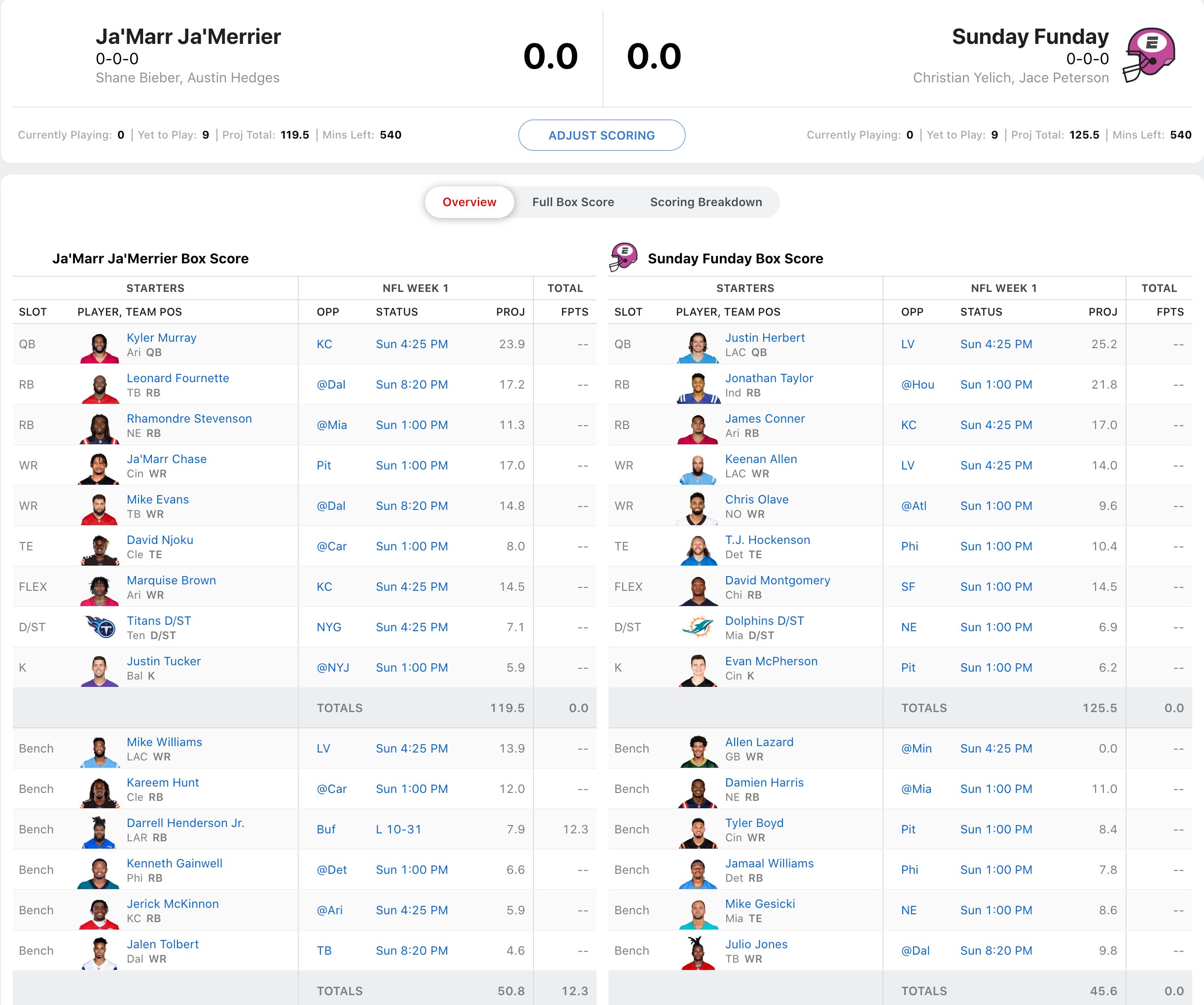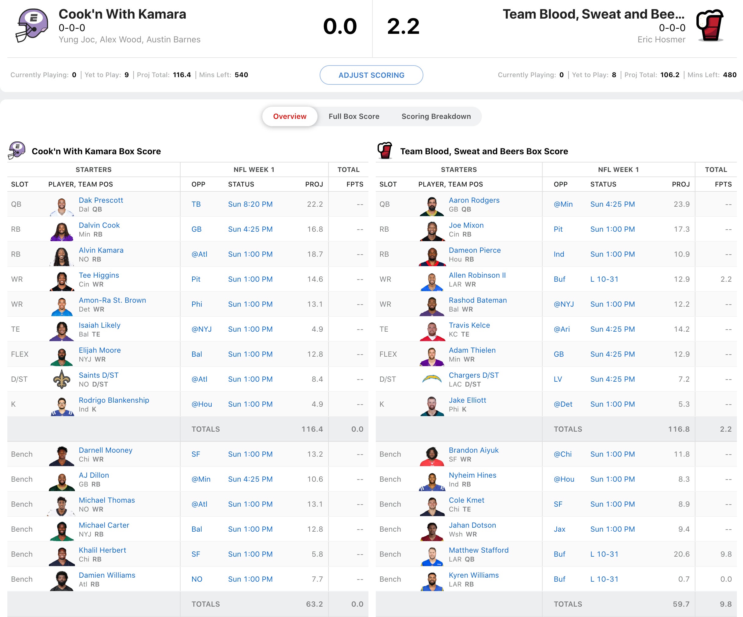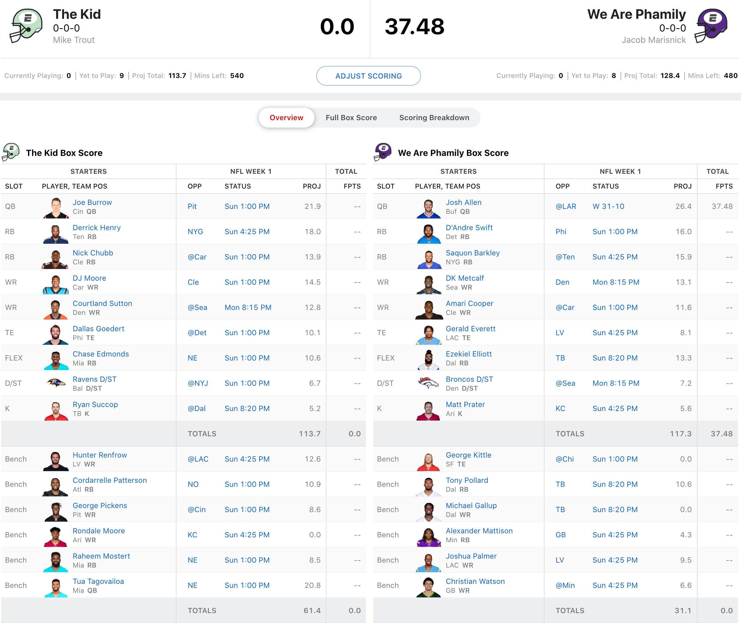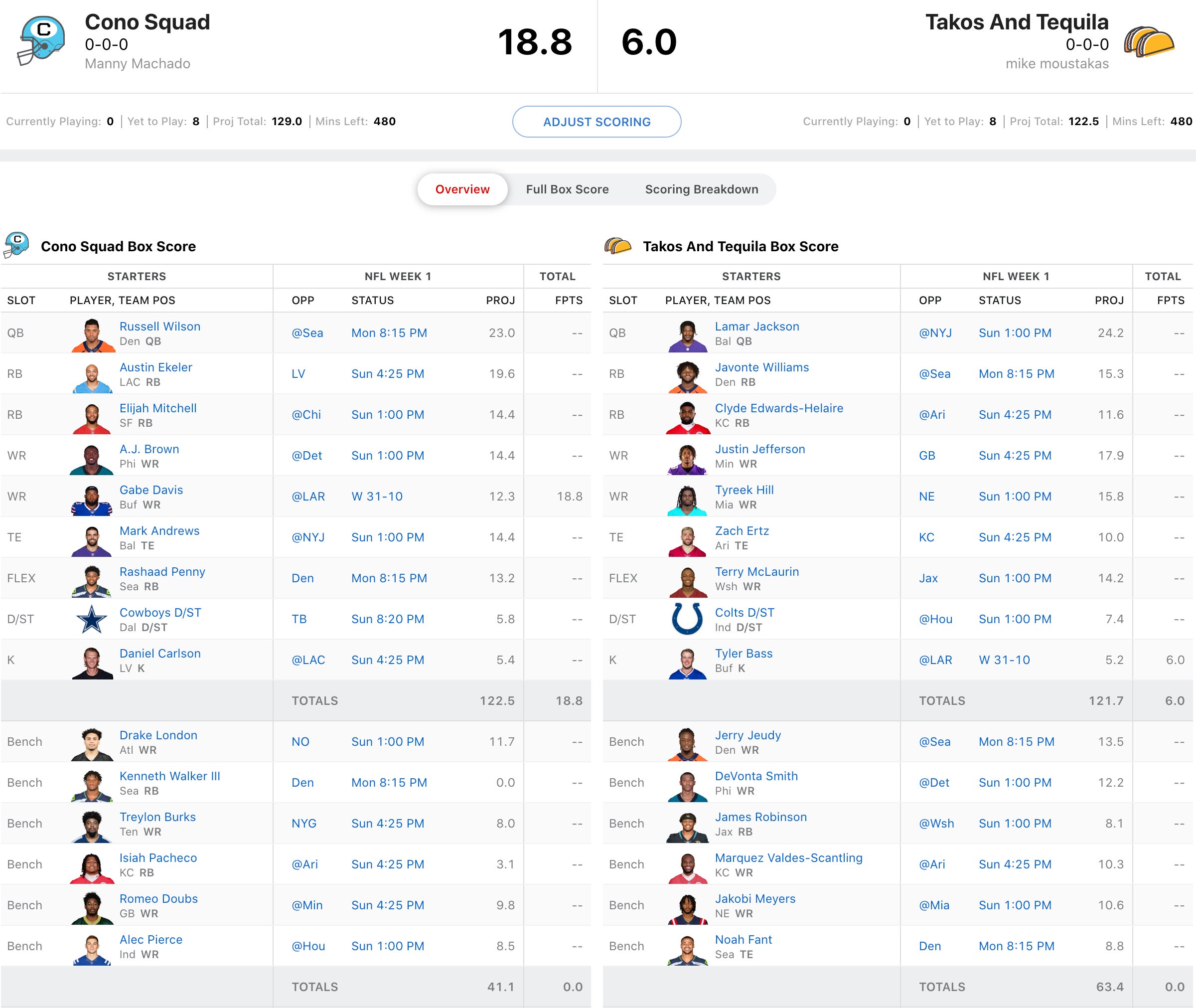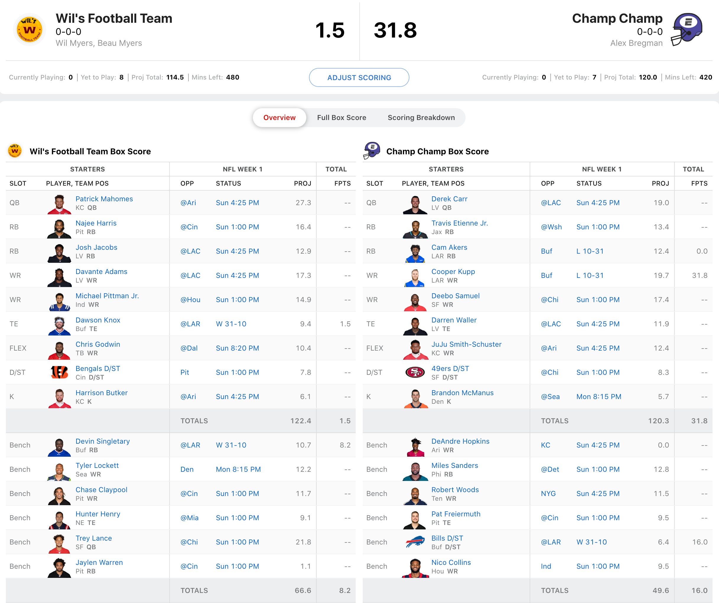 Wil Myers' squad had a rough opening with Dawson Knox putting up a 1 catch game. That being said, the league's defending champ, Alex Bregman had Cam Akers starting. So I guess it evens out. Luckily for Bregman, he had Cooper Kupp going and he had a monster game. While Bregman had a great draft, he's got a lot riding on the Derek Carr/Darren Waller combo. Let's see how it works out for him vs. Wil who has Davante Adams and Josh Jacobs going in what should be a high scoring Raiders vs. Chargers matchup.