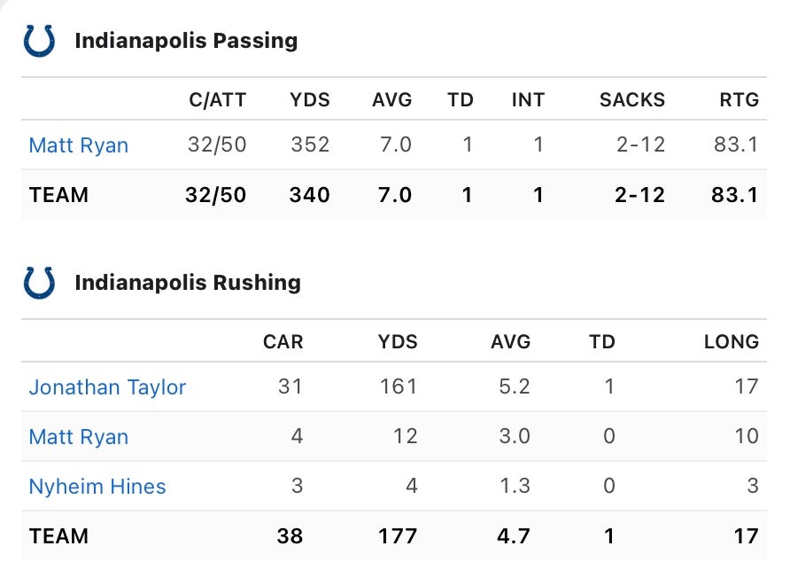 Jonathan Taylor is fine (just kidding he's fucking incredible). He ran the ball 31 times for 161 yards and a TD, which is what we need and expect from him. But for the love of god can we give him a little bit of help back there? Nyheim Hines is a fine 3rd down type back. I love him catching passes out of the backfield, but he only carried the ball 3 times. If Taylor is able to run the ball 30-40 times per game, then hooray that's amazing. Personally, I would like for the Colts to have another back that can run between the tackles and help wear down the defense.