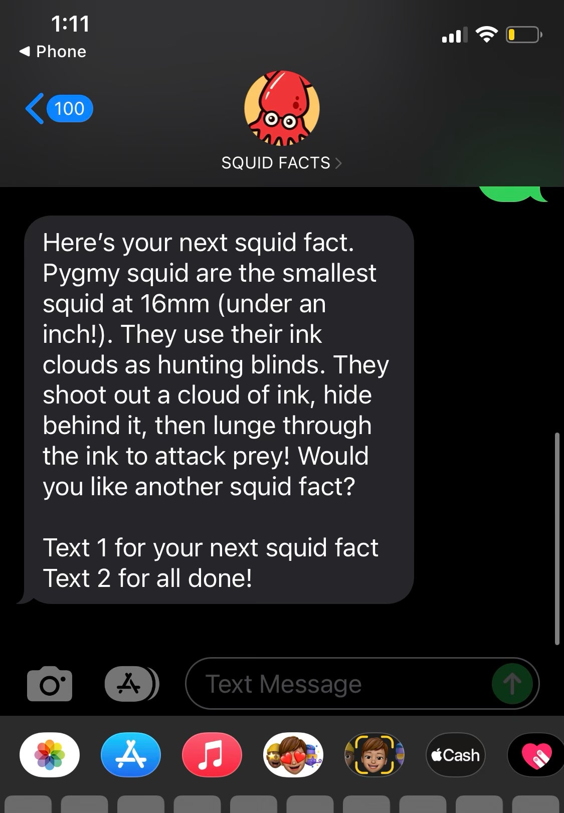 Can confirm that Squid Text thing is real. So far I've learned they have beaks for mouths, their cousin the cuttlefish has 300 color changing units per square inch that can change color instantaneously, and the smallest species is the size of a marble. These facts are going to make me insufferable in the bars.