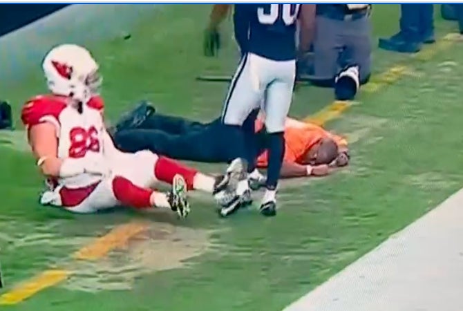 Being a field level security guard I imagine isn't an easy job. Your back is to the field the whole game and you're just watching the fans for any rowdy activity and people potentially trying to rush the field. Well this Security Guard at the Raiders vs. Cardinals game really did not see this one coming!
