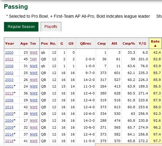 Which brings us next to his performance so far. Yes, it's only two games in. And I conceded the 2-0ness of Tampa's record at the moment. But if you're actually watching the games, you simply cannot argue he's playing like a guy who should've unretired. So far, his numbers are the worst he's put up outside of any season where he played more than a quarter of football: