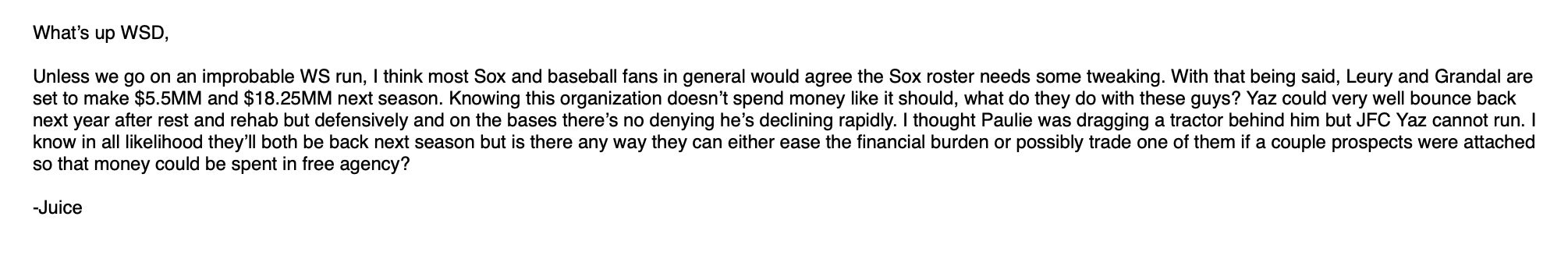 I'm still trying to wipe the stink that was that abortion of a SNF game off me, and the best way to do that is to focus on the White Sox, an organization that wants nothing more but to win at all costs. The internet is a little slow today, so I figured let's do a little mailbag extravaganza where I answer questions