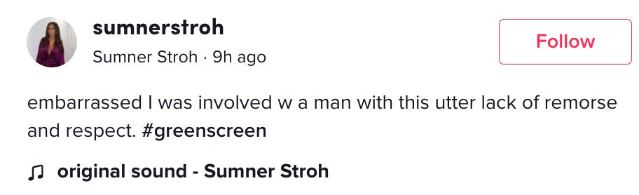 So Kelly Keegs blogged this earlier and while she made some great points which you can read about here, I just wanted to touch on one that she missed - which is the fact that Sumner Stroh IS MAKING HERSELF THE VICTIM. I honestly don't think I've ever seen a more delusional TikTok in my life. "Hey, I had sex with a man even though I knew he was married...then he slid back into my DMs...can you believe it?!" And spare me with the "I was young and naive" bullshit. Anyone with a brain knows that fucking someone who is married is rather frowned upon. Now, I will say this- she wasn't the married one, so whatever he told her or lied to her about she more than likely took as the gospel/didn't really care too much about anyway. And yes, I'm sure there was a power dynamic and I'm sure the blinders go on when a mega celebrity says they want to have sex you. But still, you *can* say no.