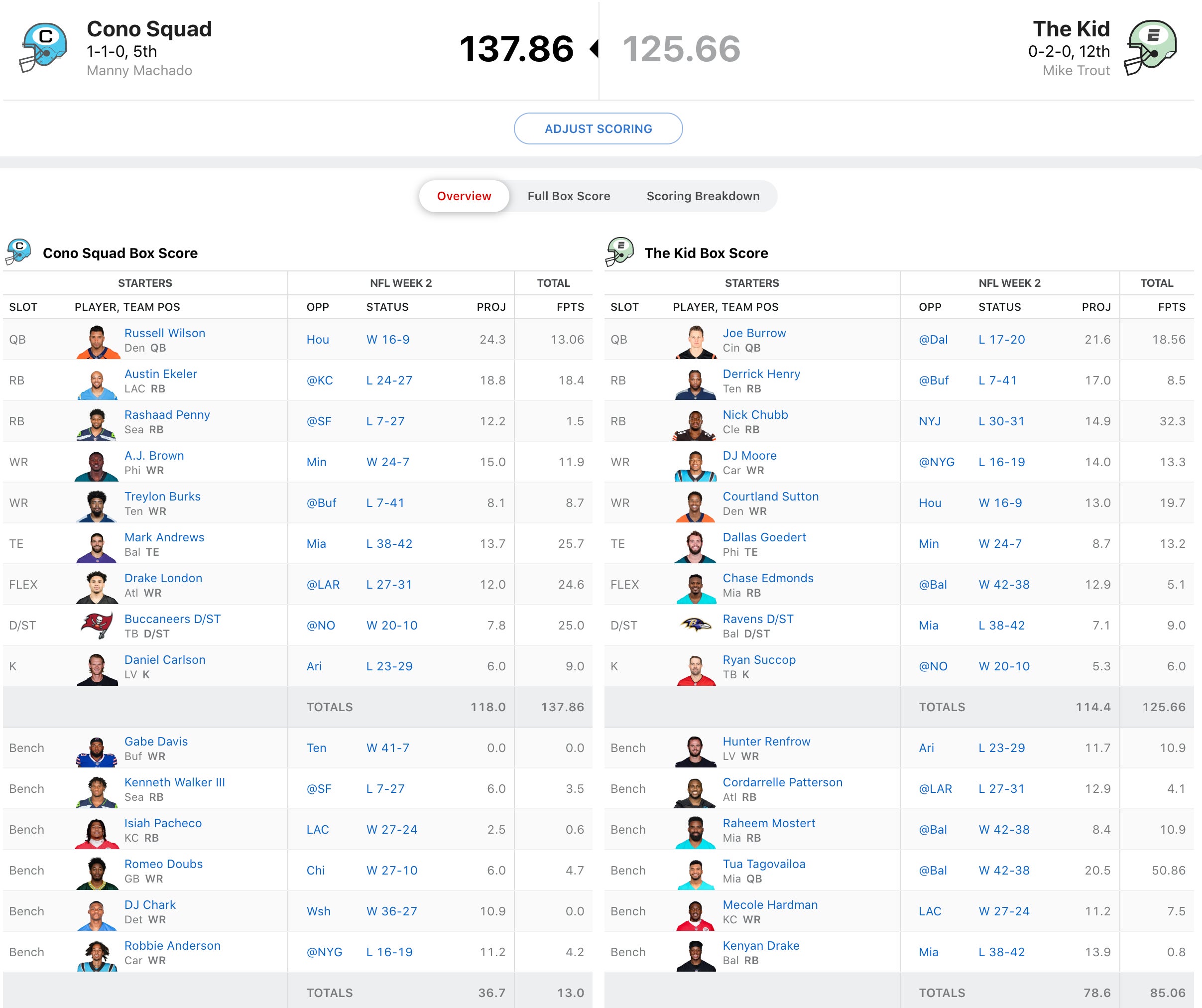 Trout needed a quiet night from A.J. Brown and for Derrick Henry to go off. After an early TD for Henry, things were looking up. Unfortunately for him, that didn't continue and he finished with four of his guys underperforming their projections. To make matters worse, he sat Tua Tagovailoa who put up 50.86 points on his bench, which would have flipped the result. But hard to argue with his decision making leading into the matchup as Tua hadn't shown enough Week 1 to garner the start against a turnover hungry Ravens D/ST. Machado had some HUGE performances out of his TE, FLEX, and D/ST as Mark Andrews, Drake London, and the Buccaneers put up a combined 75.3 points which was the difference in the game.
