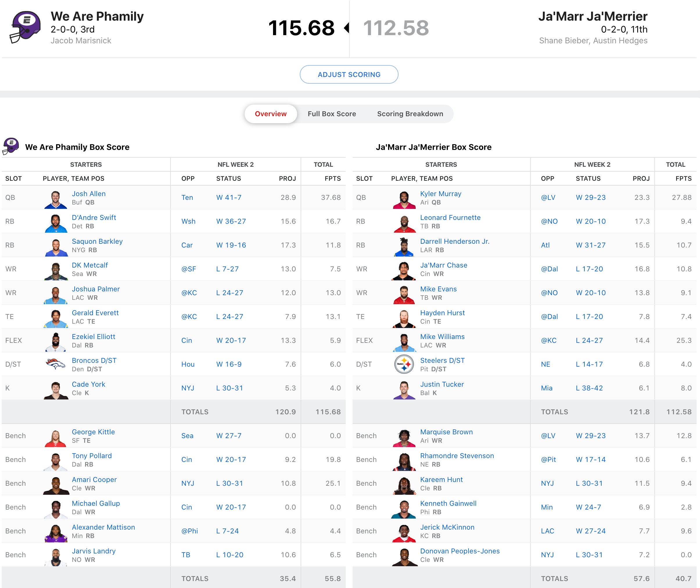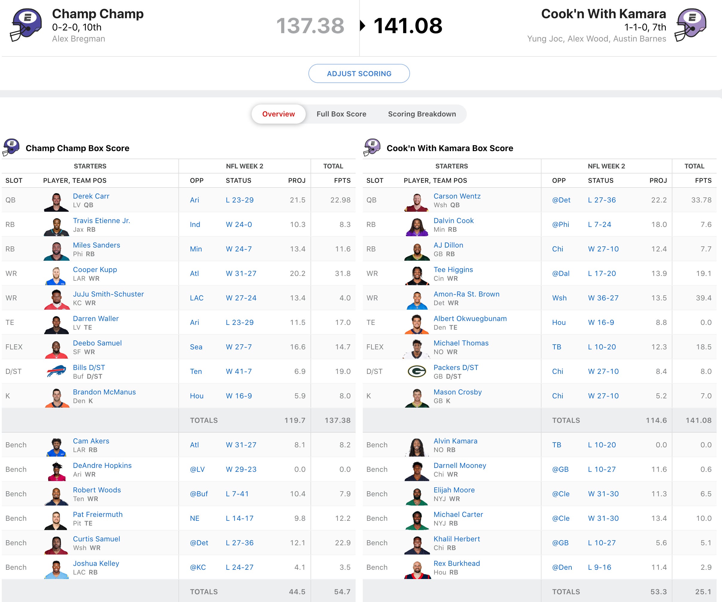 A huge comeback on Monday night by the defending champion, Alex Bregman fell short. In hindsight, Curtis Samuel would've won him the game, but JuJu Smith-Schuster against the Chargers was an understandable play. The triad of Joc Pederson, Alex Wood, and Austin Barnes overcame their namesake's absence and got a big game from Carson Wentz, who filling in admirably for the injured Dak Prescott. Amon-Ra St. Brown also blew up just as I had forecasted. Overcoming a donut from Albert O to even their record to 1-1, team Cook'n with Kamara has their arrow pointed up.