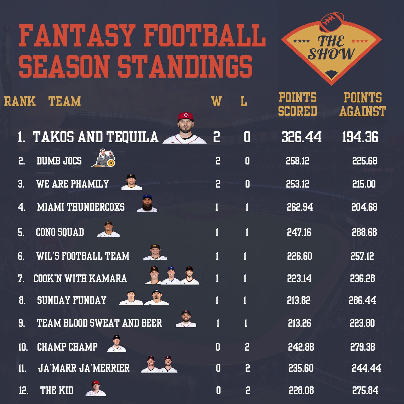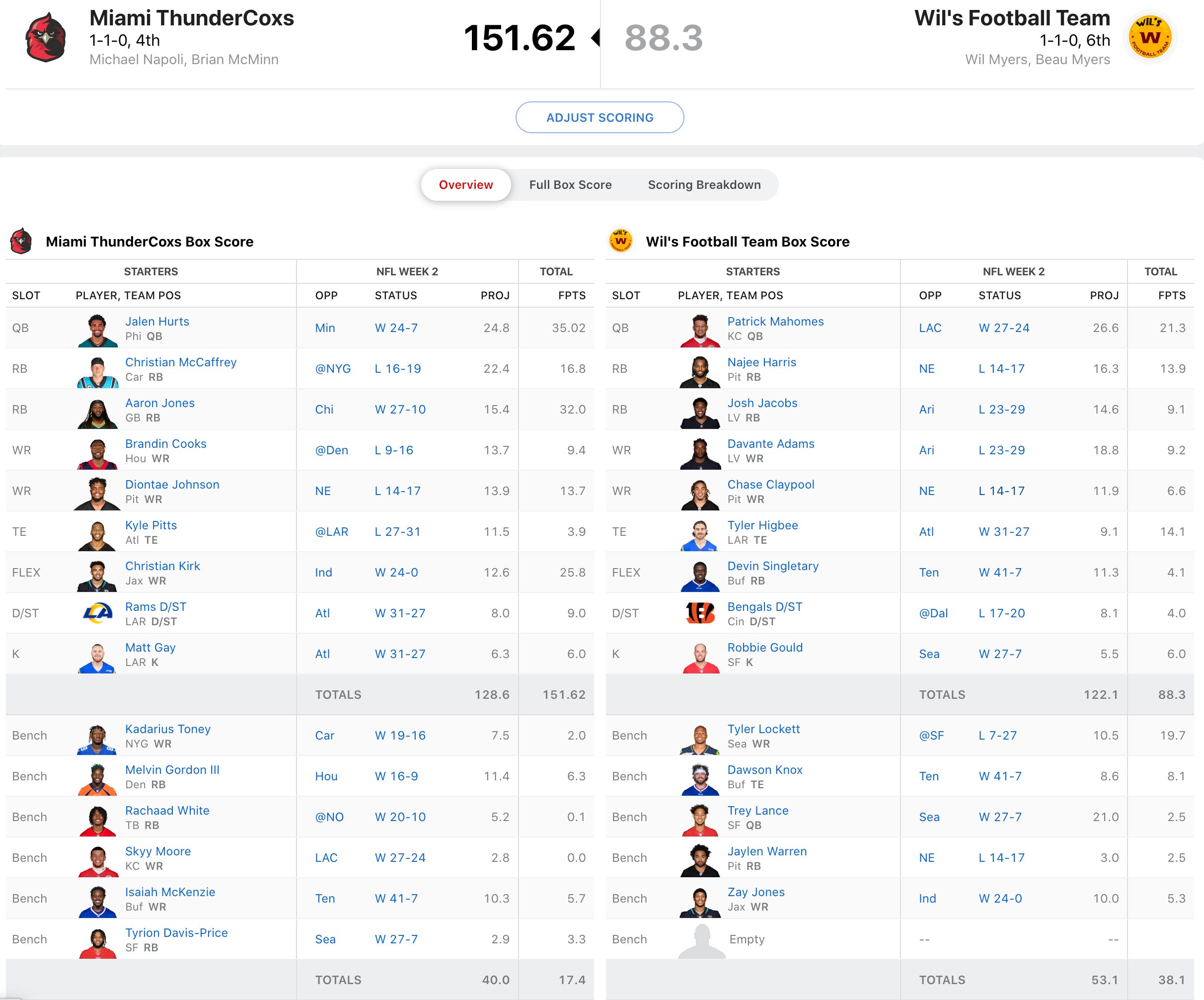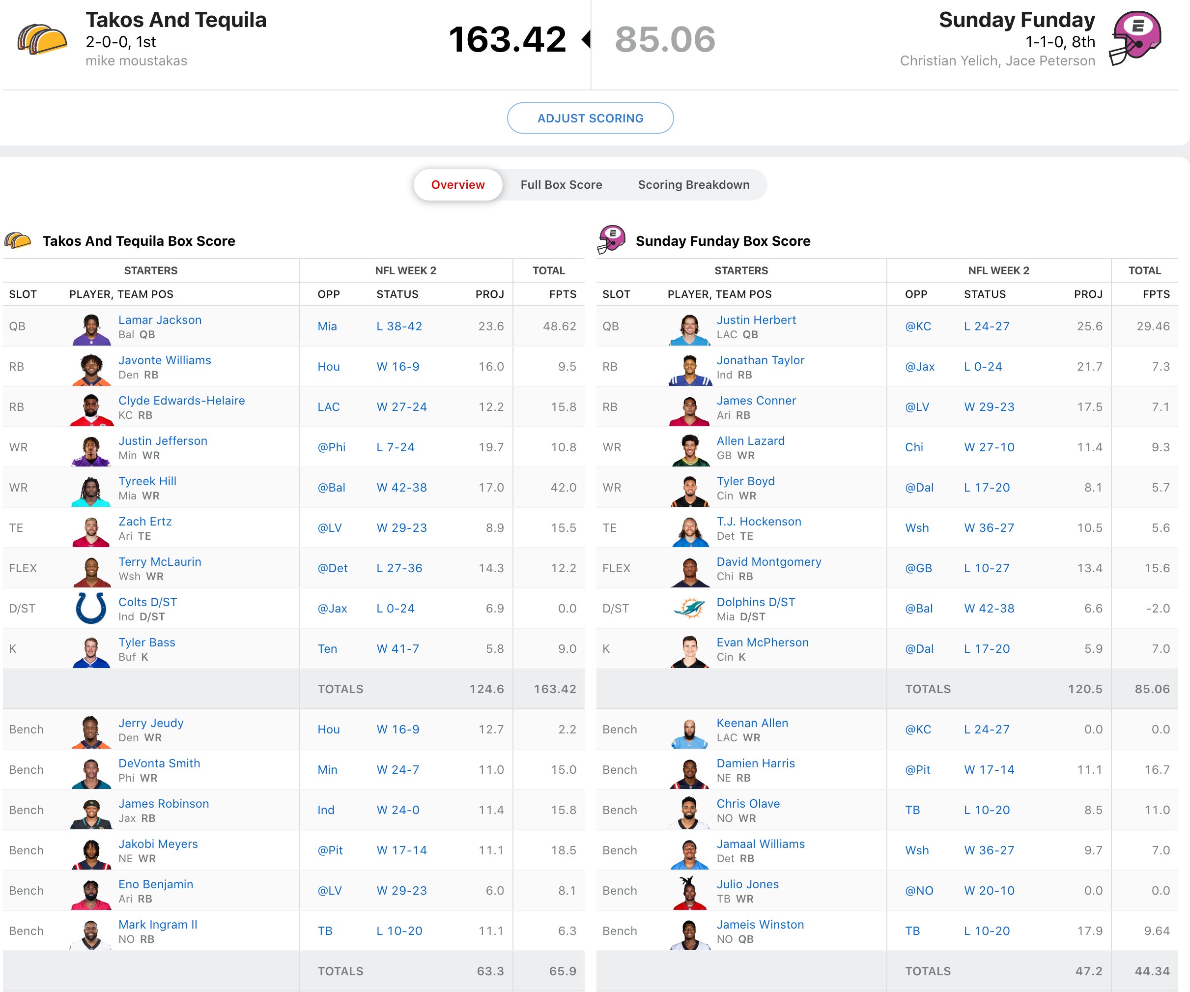 It may just be Mike Moustakas' league to lose. He had down games from Javonte Williams and Justin Jefferson and it didn't even matter. Moose has scored 163 points for the second straight week and his team has no holes outside of D/ST which is mainly streamable. He is the clear frontrunner in the league and the combo of Christian Yelich and Jace Peterson weren't able to muster a fight with only two guys scoring in double digits.