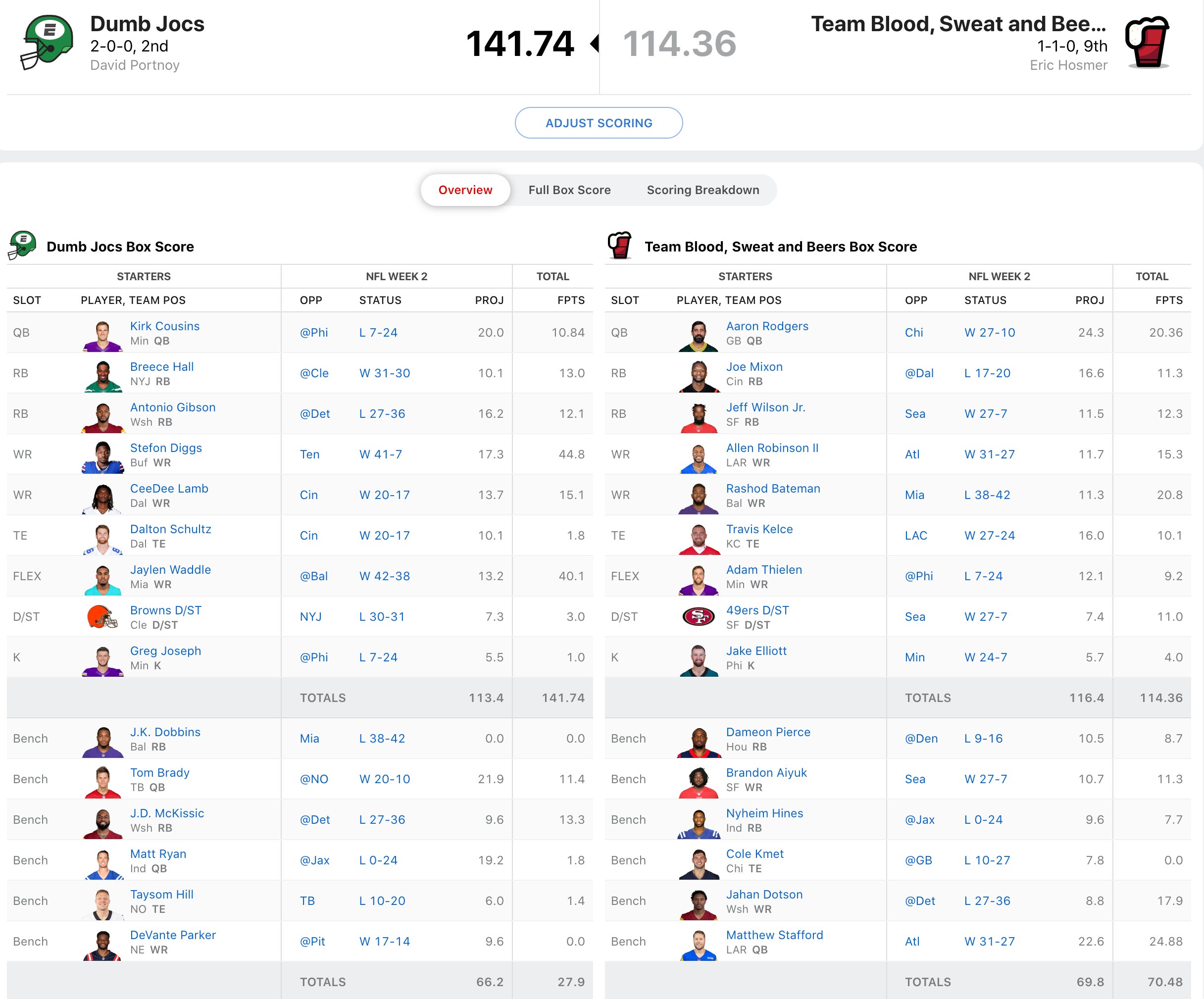 Don't look now, but Dave Portnoy's team is also a wagon. After Diggs' 3rd TD on Monday Night, Dave texted the group "I got 40 pt. receivers coming out of my asshole". Hard to disagree as he's overcome sub-par QB play to win both his matchups so far. Eric Hosmer had a decent showing, but was in a lot of trouble after his ace, Travis Kelce underperformed his projection by 5.9 points on Thursday Night.
