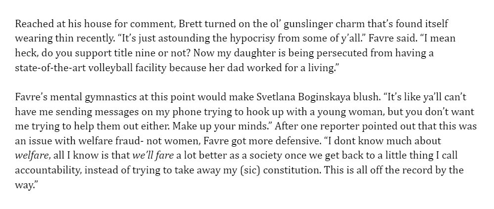 Alot of you guys dont have the credit necesary to unlock all of the content that the Athletic has to offer. For instance after passing their credit check to achienve double diamond level, I get Ken Rosenthals to manage my fantasy baseball team the Seamhead Express (we're in the finals nbd). In this weeks column available only at the country club tier we place a call to Brett Favre at his plantation estate down in Mississippi: