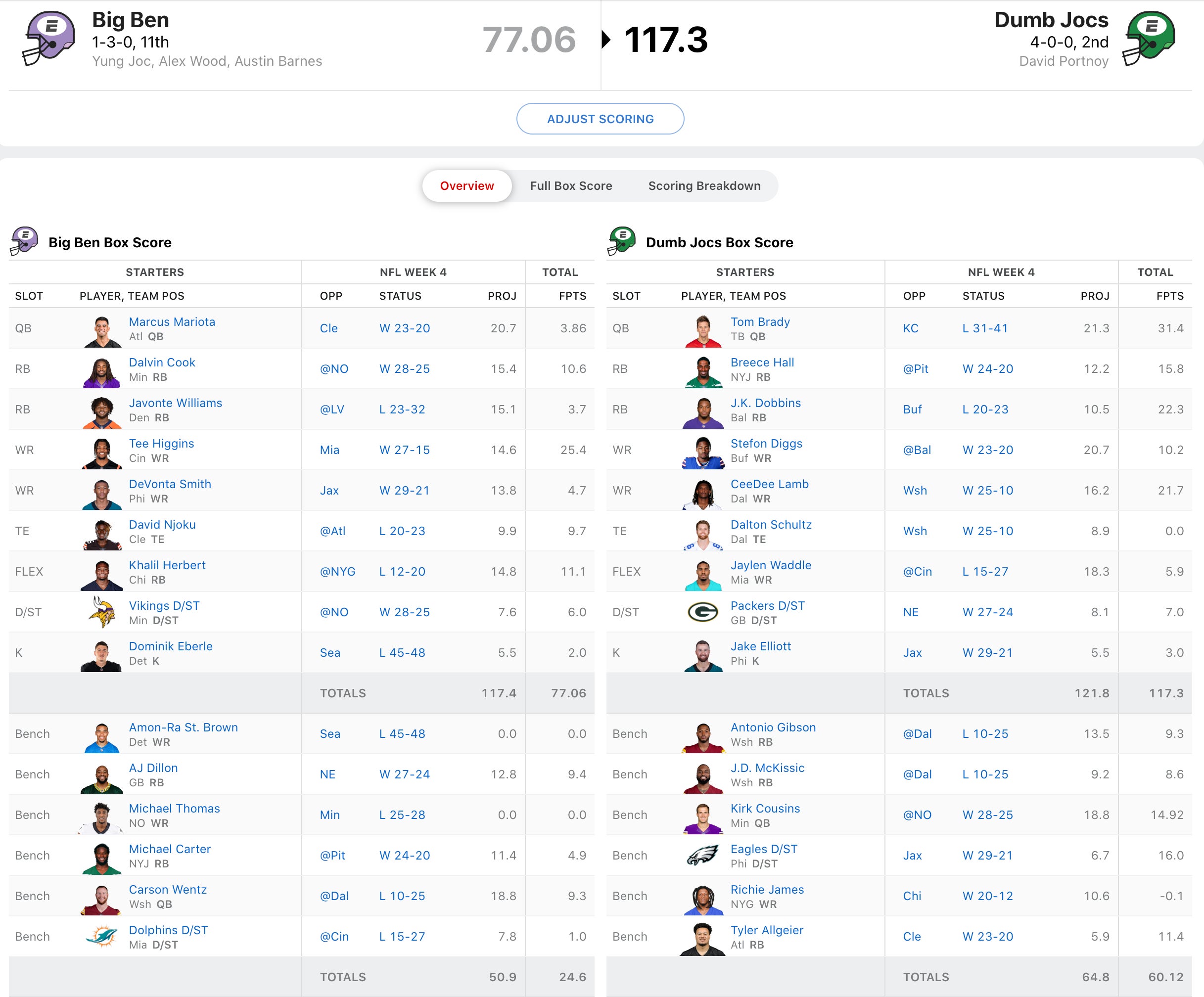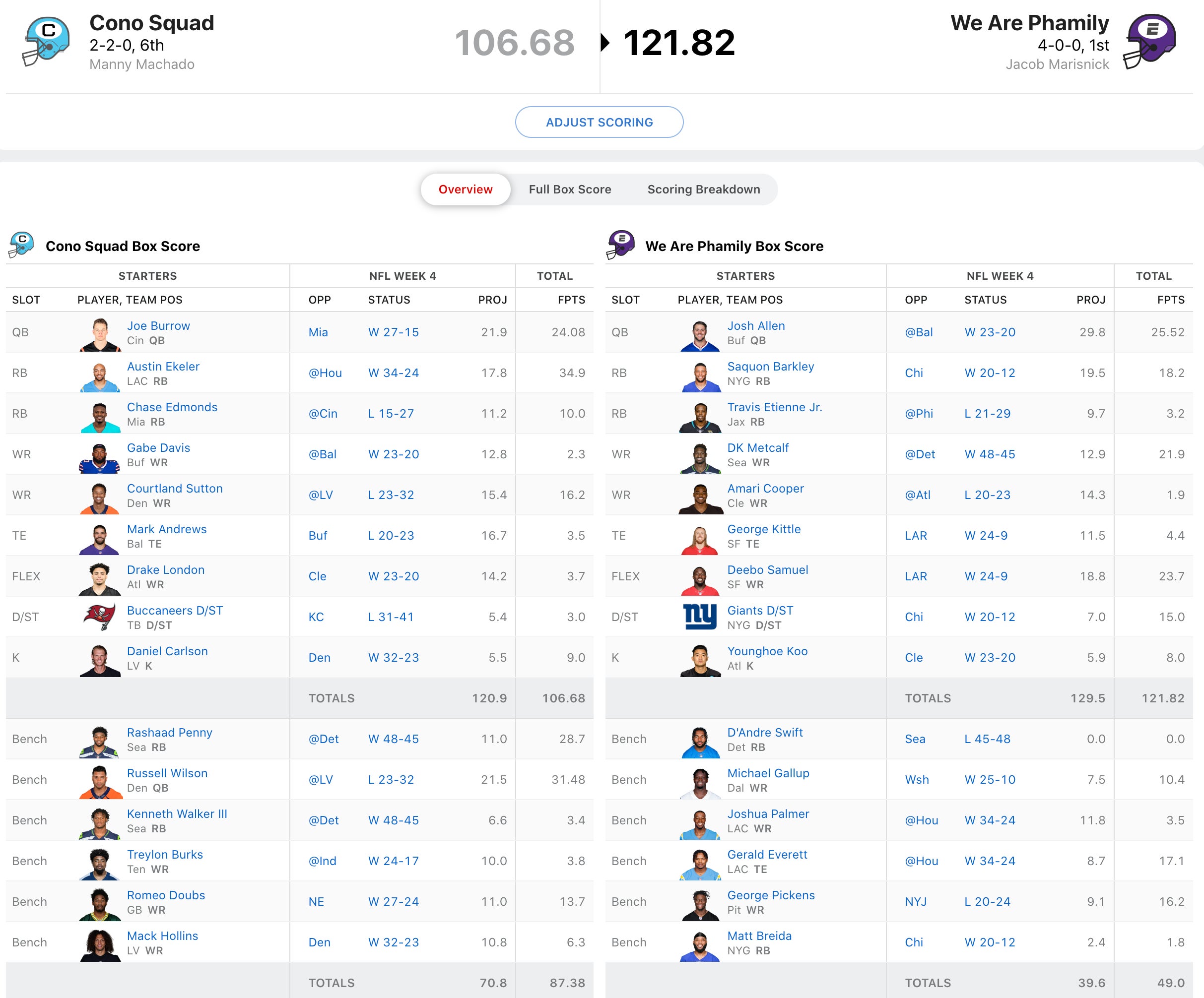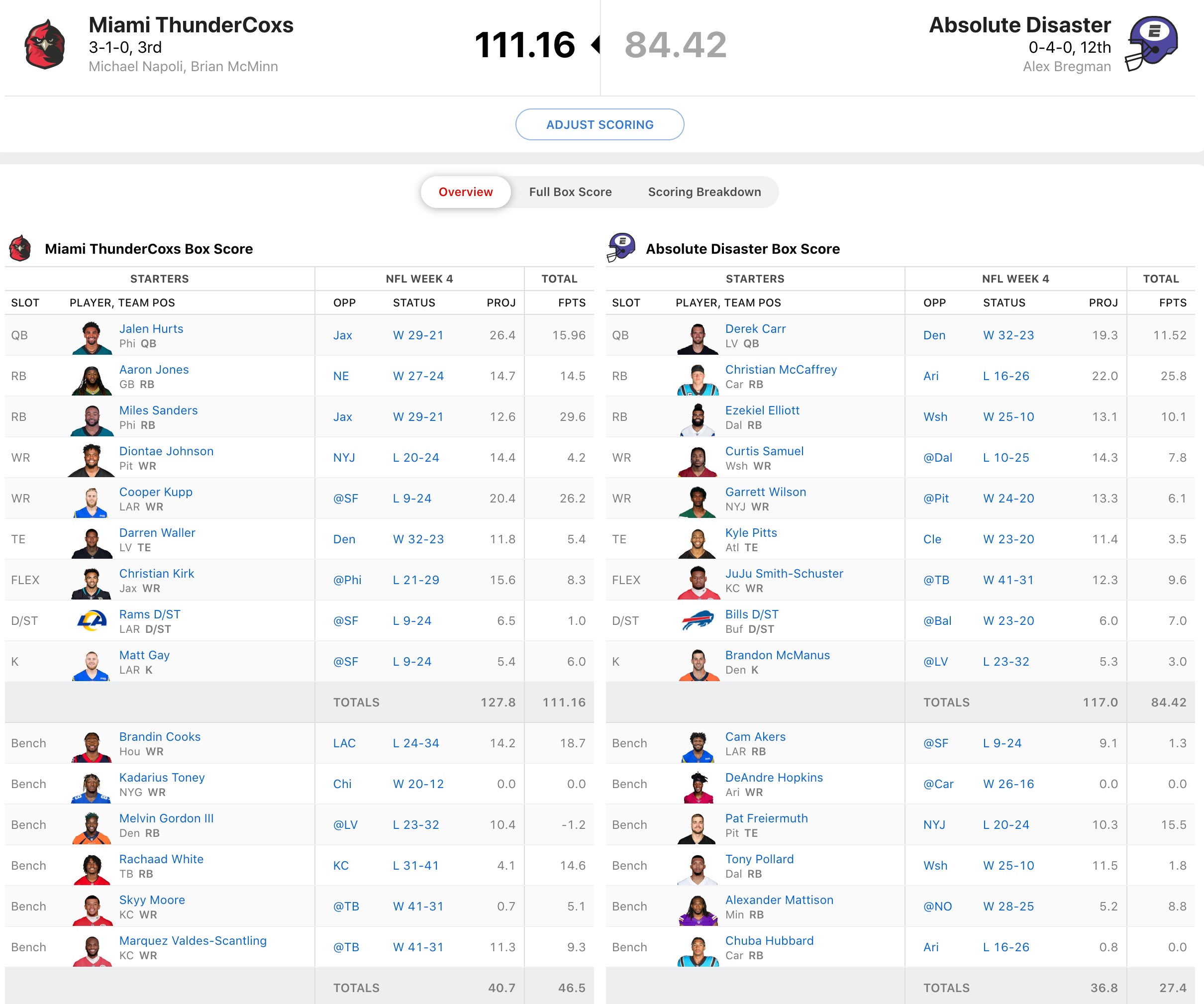 Machado got a breakout performance from Austin Ekeler, but leaving Rahaad Penny on his bench for Chase Edmonds ultimately cost him 18.7 points and the win. Manny got let down by his WRs with Gabe Davis and Drake London both underperforming projections by 10+ points each. Meanwhile, Jake Marisnick just keeps dominating. A monster performance from Deebo Samuel on Monday Night sealed the deal for him to move to 4-0 despite getting 5.1 points combined from his RB2 & WR2 spot.