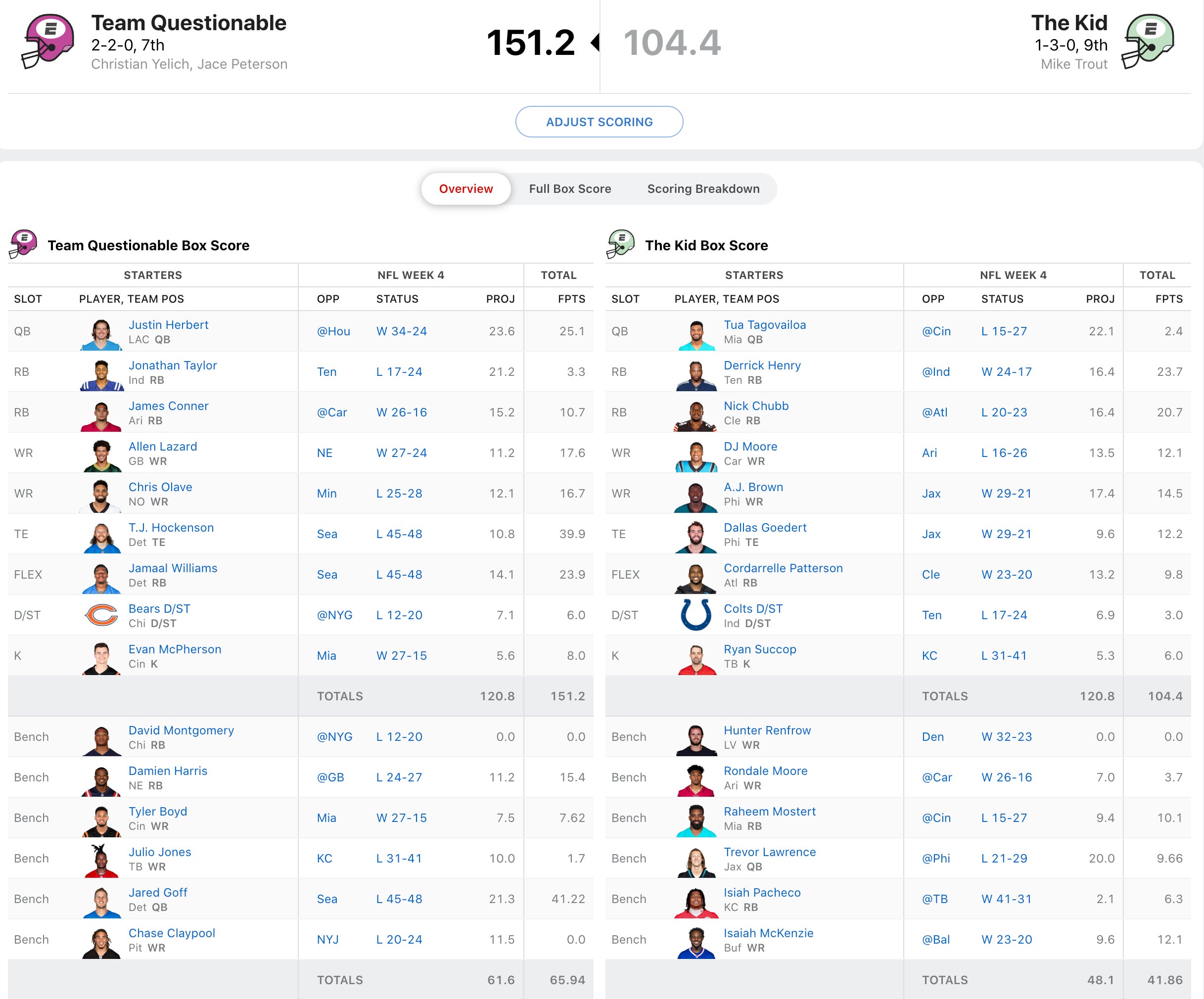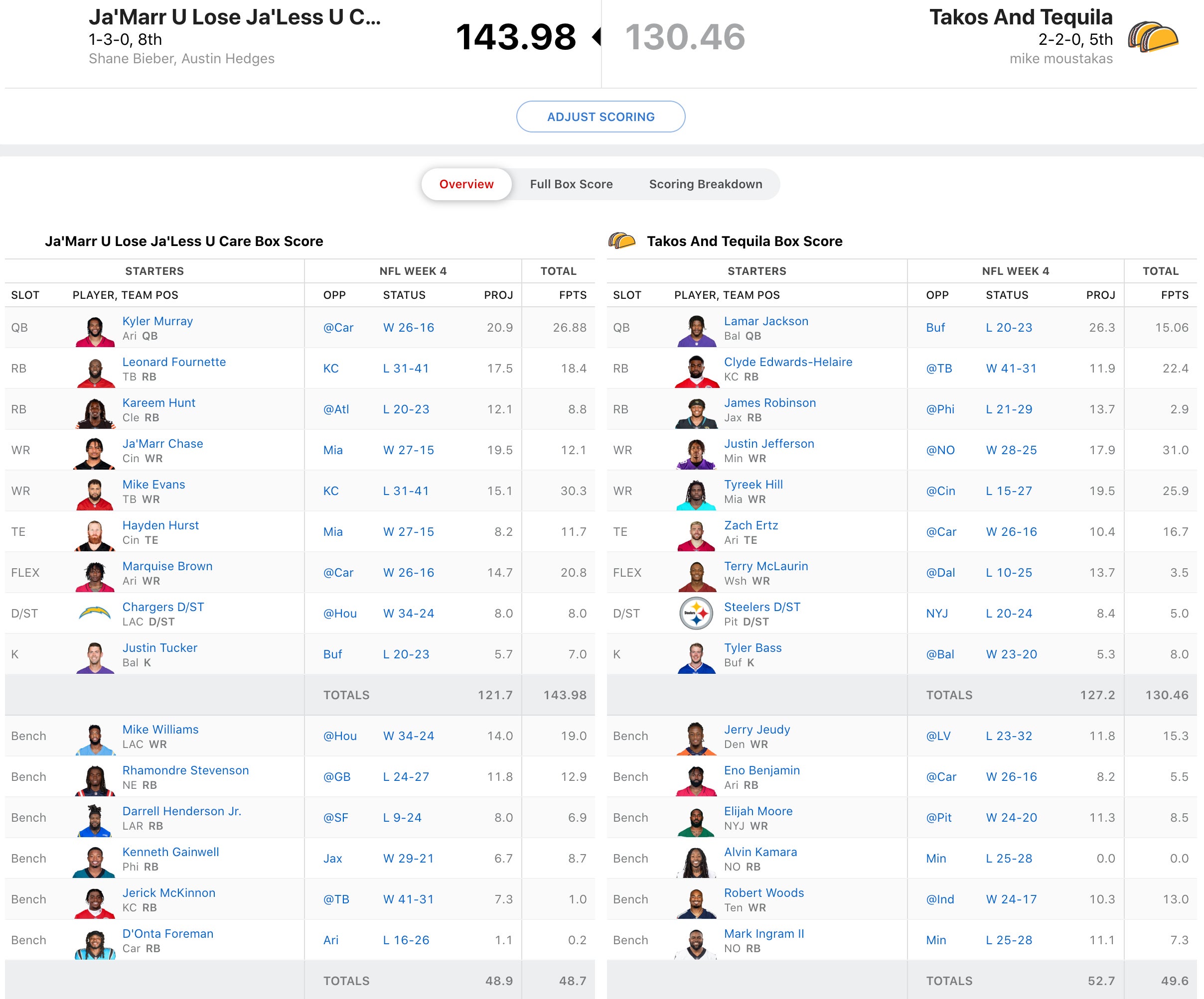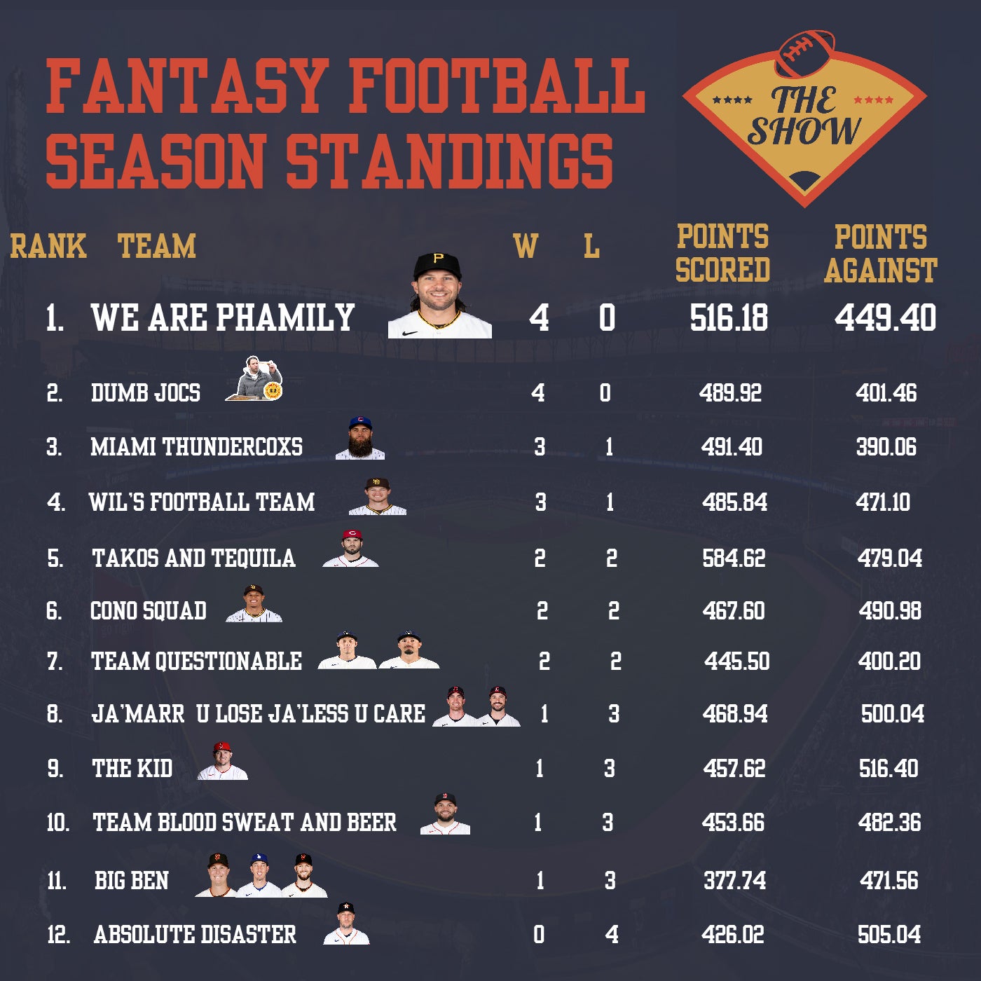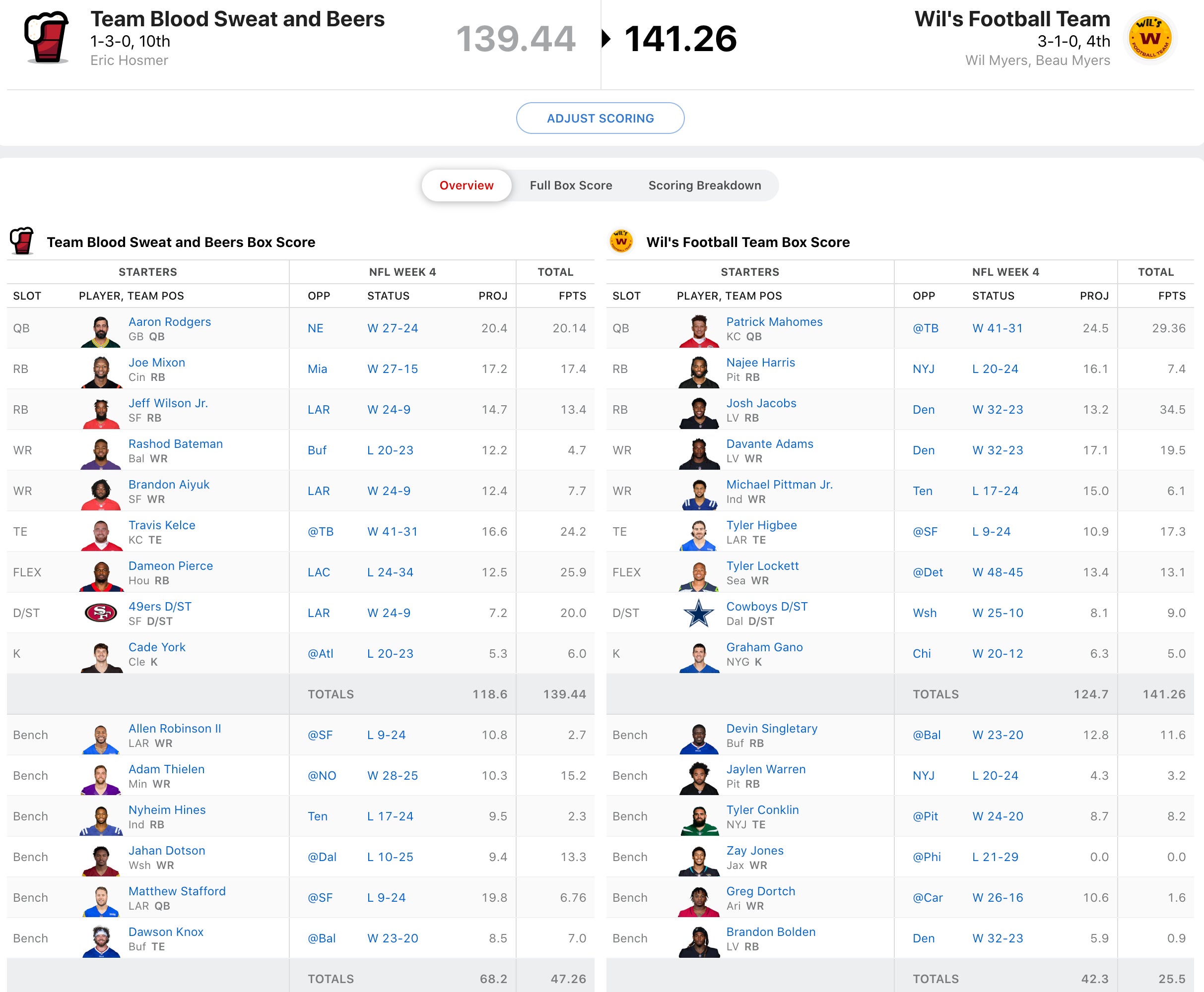 Had Hosmer just started Adam Thielen or Jahan Dotson in place of either Rashod Bateman or Brandon Aiyuk, he'd have the win. His team played a great game with all seven of his other players either being right at their projection or outproducing it. But Wil Myers had big performances from Patrick Mahomes, Josh Jacobs, Davante Adams, and Tyler Higbee who had 10 catches on Monday Night to edge out Hosmer by under 2 points. A painful way to lose, but here's where we stand after four weeks:
