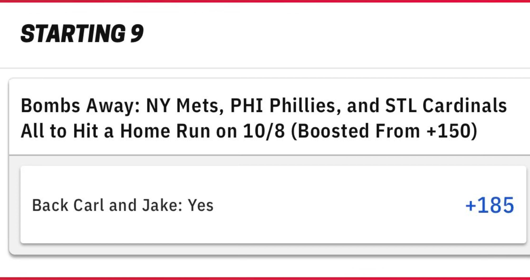 That's a pretty easy ask when you really think about it. The Mets, Phillies and Cardinals are all top 10 in slugging percentage. There's gonna be some pops on the board and +185 is a great number for the action. So go get a taste under the exclusives tab here:
