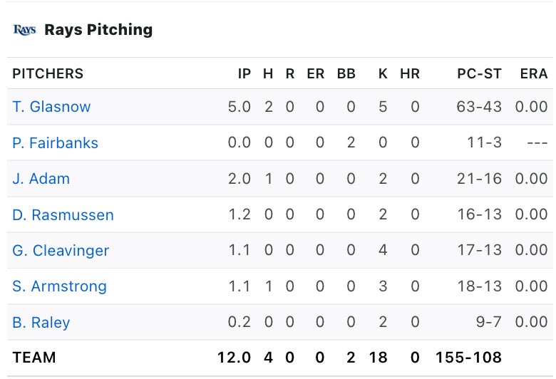 This game could very easily go 27 innings and I really mean that. Easily. Never seen so much good pitching and defense. And to be fair the hitters are putting some decent swings together. It's just a matter of dominant pitching. From Tyler Glasnow to Drew Rasmussen and everyone inbetween. Just look at these box scores: