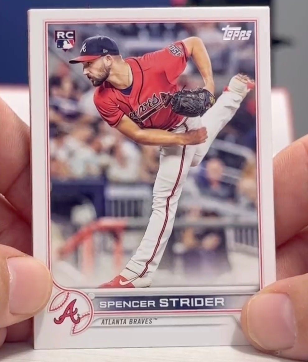 Wordplay is something most people do not think to consider. For example, if you have a Johnny Bench sitting in the dugout card– that's Johnny Bench on a bench. If you have Pokey Reese eating a peanut butter cup– that's a Reese's Pokey Reese. In this pack, I was fortunate enough to get a Spencer Strider in stride card.