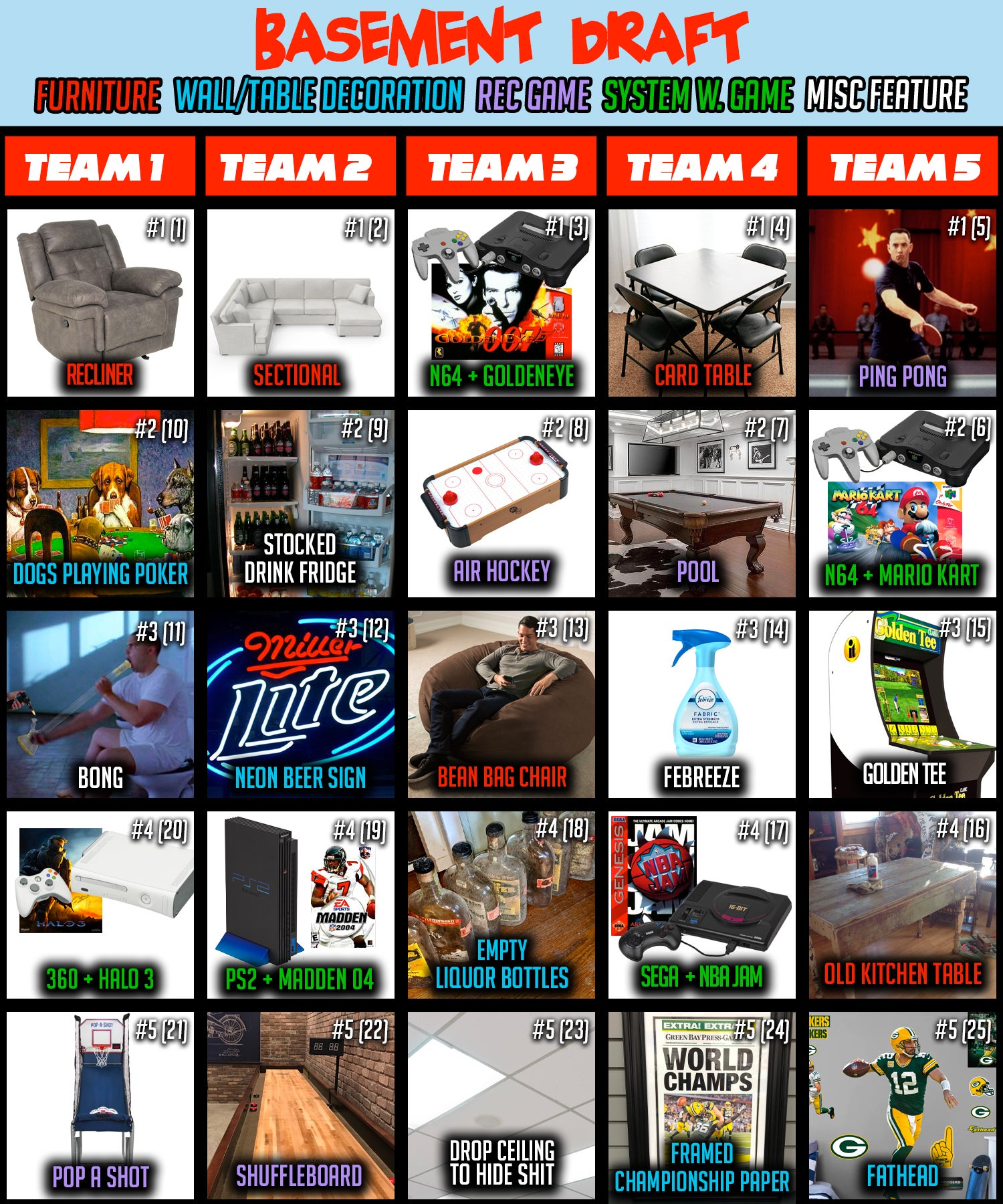 In the THIRD ROUND, Chief decided to use his Misc. Feature selection. Two had been picked before him with a stocked drink fridge and a bong going in the 2nd and 3rd round. So many selections on the board including two taken after him with a Golden Tee game and a drop ceiling to hide stuff, and Chief settled on Febreeze. The anti-odor spray. Just a stunning selection as the 3rd overall Misc. Feature. A spray you can buy for $5 at your local convenience store. You can have ANYTHING IN THE WORLD and you choose Febreeze. Misc. Feature is so wide open. He could've picked the ones taken after him, he could've picked a lock on the basement door, a separate entrance to the basement, soundproof walls, but he chose Febreeze. Just an all-time pick from an all-time guy. I love Chief, but this was a flub of epic proportions that should not be forgotten about for a long time. Burrata Gang - come get your man.