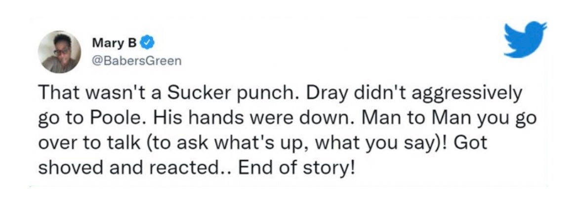 Wonder what her take would’ve been had roles been reversed. What if Draymond was the smaller guy, “being called bitch numerous times” by Poole in this practice, before calling a foul and being confronted, with his hands down by his sides, and then clobbered with a right hook in the jaw out of nowhere?