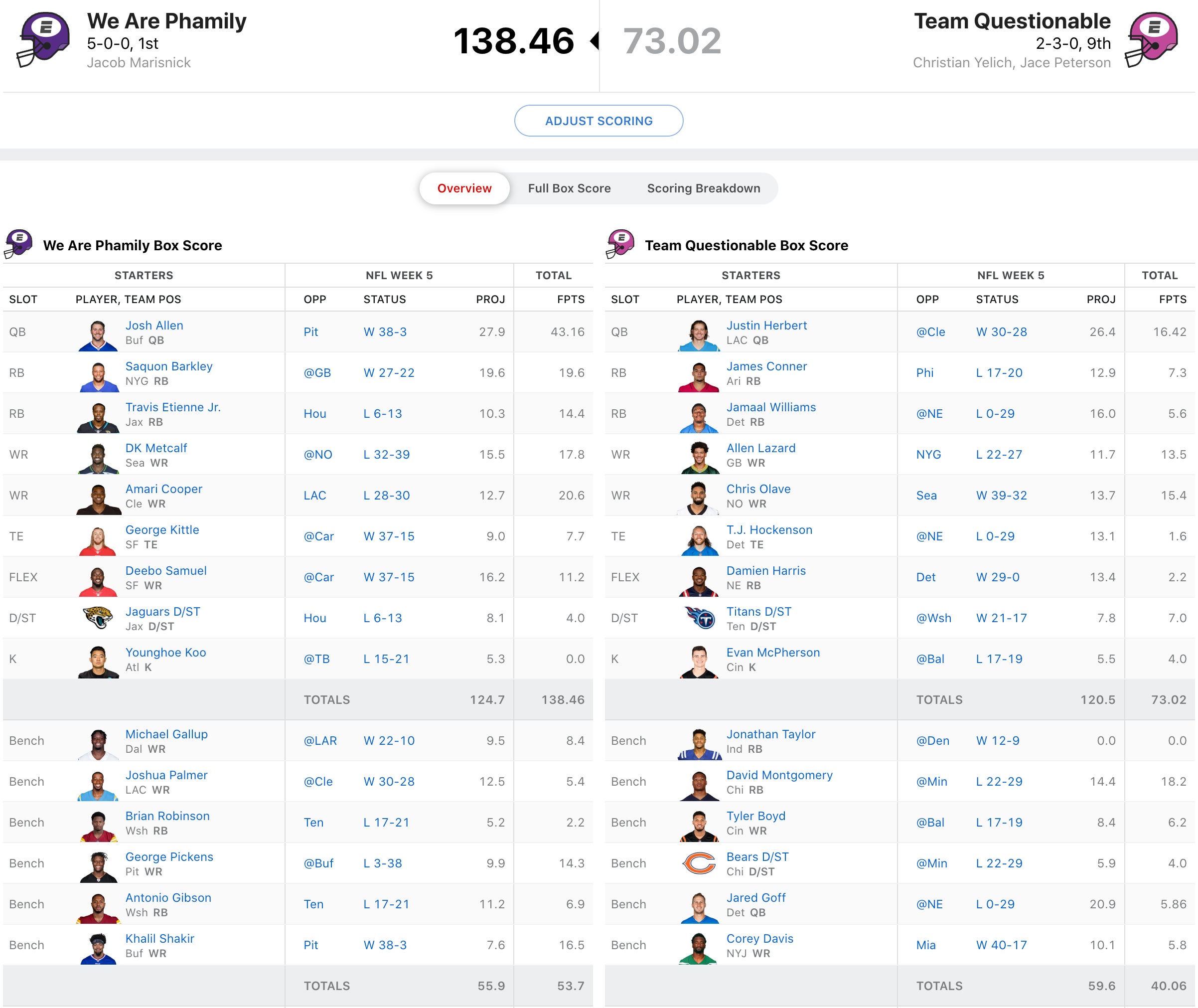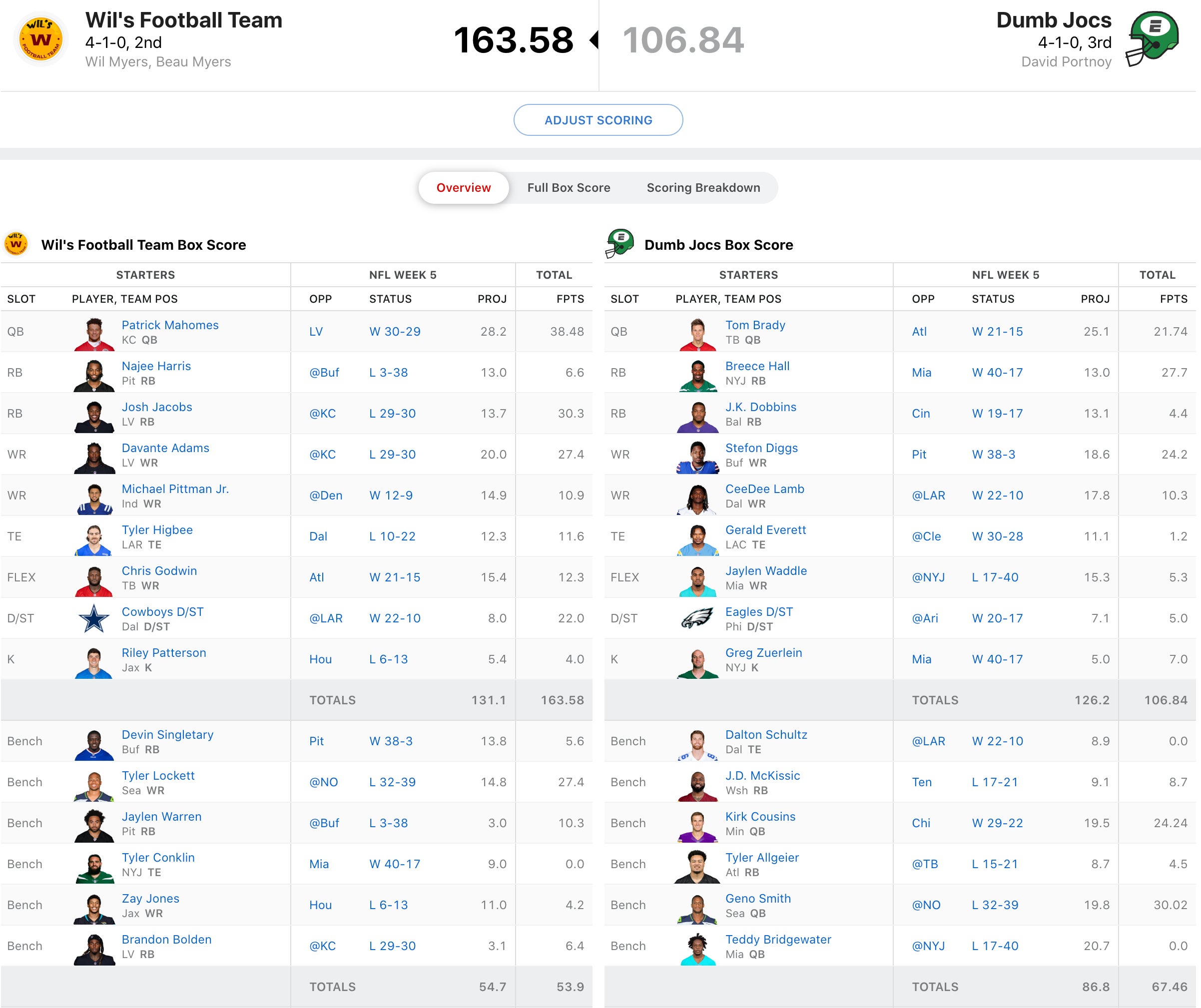 Myers team went absolutely bananas. 163.58 is the highest score by a team in the league this year and it could've even been bigger had he started Tyler Lockett. Dave had a solid lead heading into Monday Night Football, but Patrick Mahomes, Josh Jacobs and Davante Adams combined for over 96 points! Just an incredible performance from that trio. Wil also got a big boost from the Cowboys D/ST which almost did 3X their projection in a dominating win vs. the Rams. Meanwhile, Dave's team didn't have a great showing. New TE Gerald Everett had a mere 1 catch. JK Dobbins didn't do nearly enough, underperforming his projection by 8.7 points and Tom Brady was the worst QB on the roster despite a tasty matchup vs. the Falcons. Both teams are now 4-1 on the year.