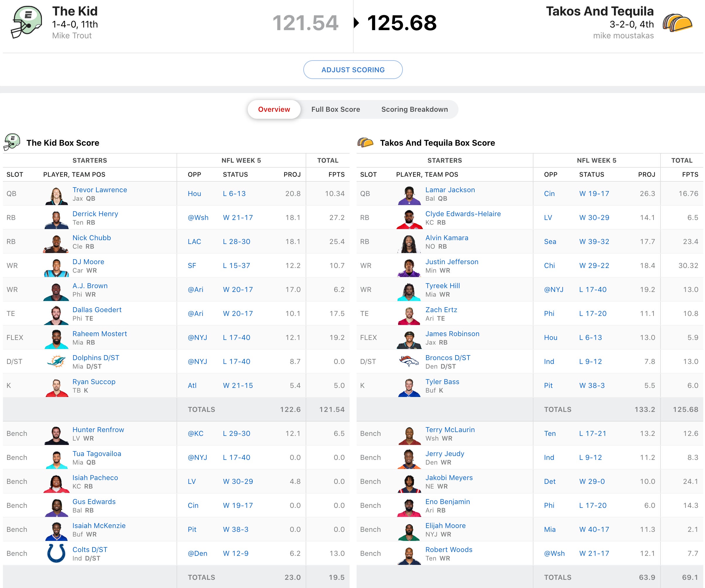 He loses by 4.14 points to the league's scoring leader Mike Moustakas and gets another subpar game from his signal caller position. Trevor Lawrence didn't put up a TD in a 6-13 loss to the Texans. His backfield nearly carried his team to the win with Derrick Henry, Nick Chubb, and Raheem Mostert averaging almost 24 points per man. He got a tough break from his Defensive unit as well with the Dolphins giving up a 40 burger to the Jets, meanwhile the Colts scored 13 points in fantasy and only gave up 9 points in real life. Trout falls to 1-4 with the loss, meanwhile Moose gets back on the winning side after dropping two straight. Despite Lamar Jackson having a subpar game, he pulled through on the backs of Justin Jefferson and Alvin Kamara. But he started the Broncos Defense against Matt Ryan's corpse which scored 13 points and was the difference in the matchup.