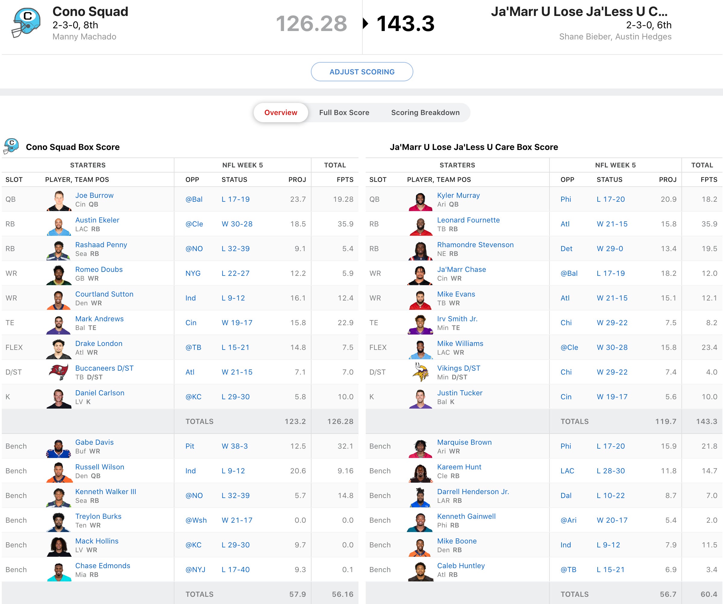 Shane Bieber and Austin Hedges were carried by Barstool Lenny's 10 catch 2 TD performance which is 22 points without even gaining a yard in a PPR league. It could've been a wider gap, but they sat Hollywood Brown who was their 2nd highest scoring WR. What will they do with Ja'Marr Chase who could be an interesting trade chip for a team on the rise. Meanwhile, Manny Machado squandered a massive game from Austin Ekeler who matched Fournette's output with 35.9 to tie him for RB1 on the week. He also sat Gabe Davis who put up a monster 32.1 points for Romeo Doubs which eventually cost him the matchup. With even records and points being the tiebreaker, these two will be duking it out for positioning the next couple months.