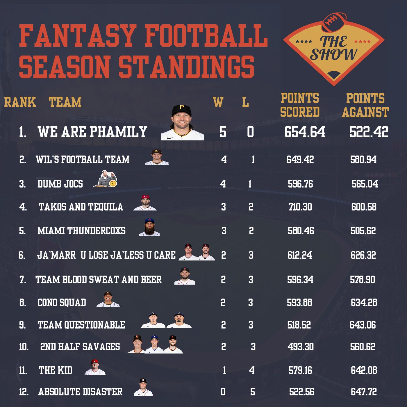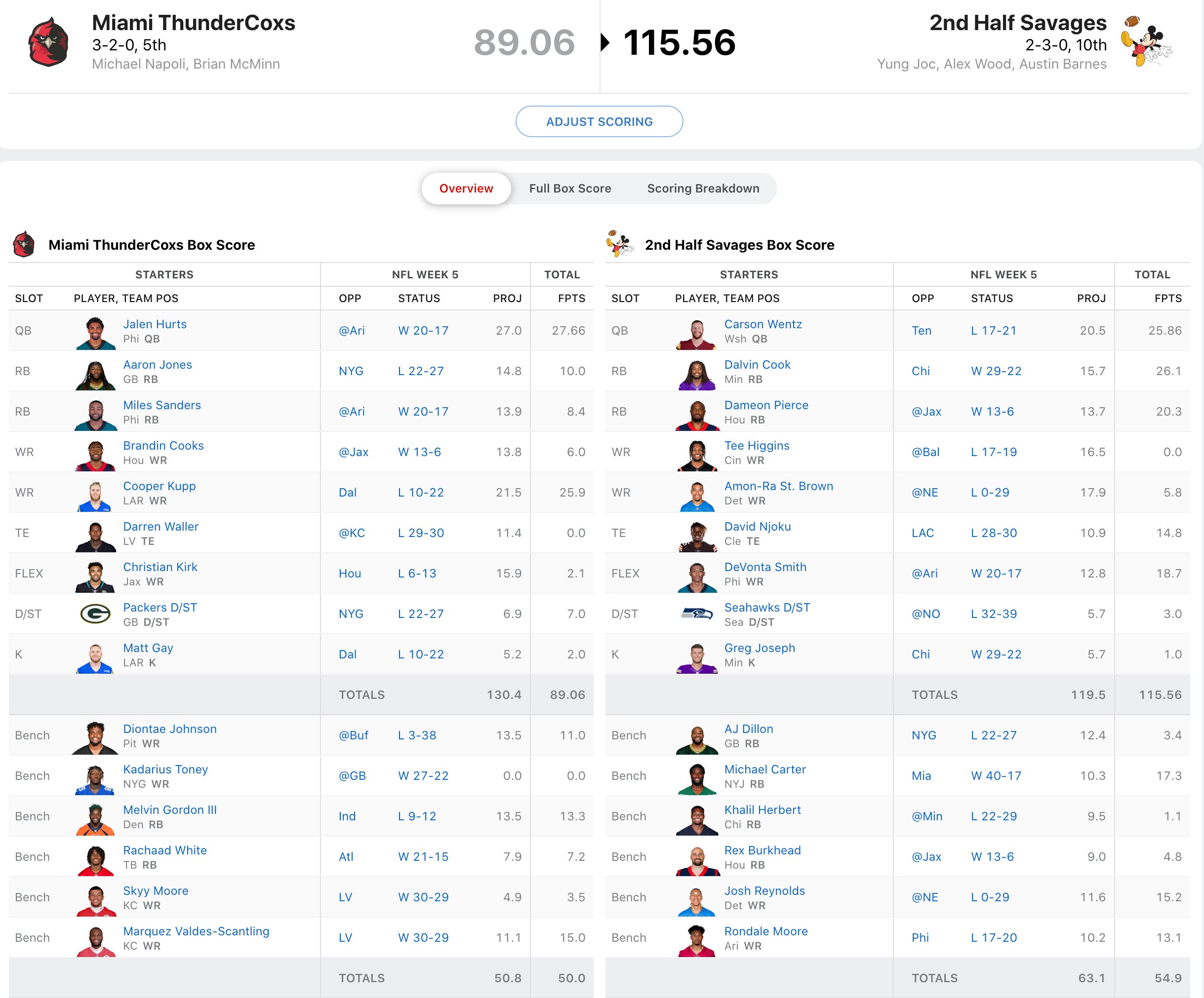 Napoli falls to 3-2 after putting up a dud with only Jalen Hurts and Cooper Kupp really showing up. Meanwhile the trio of Joc Pederson, Austin Barnes, and Alex Wood overcame a donut by Tee Higgins to get their 2nd win of the season. It's a dangerous life with Carson Wentz as your fantasy starter, but he came through in Week 5 with 25.86 points. They also got 20+ point performances from their backfield of Dalvin Cook and Dameon Pierce. Meanwhile, they may have dealt a lemon in Michael Thomas who missed this week's game with an injury.