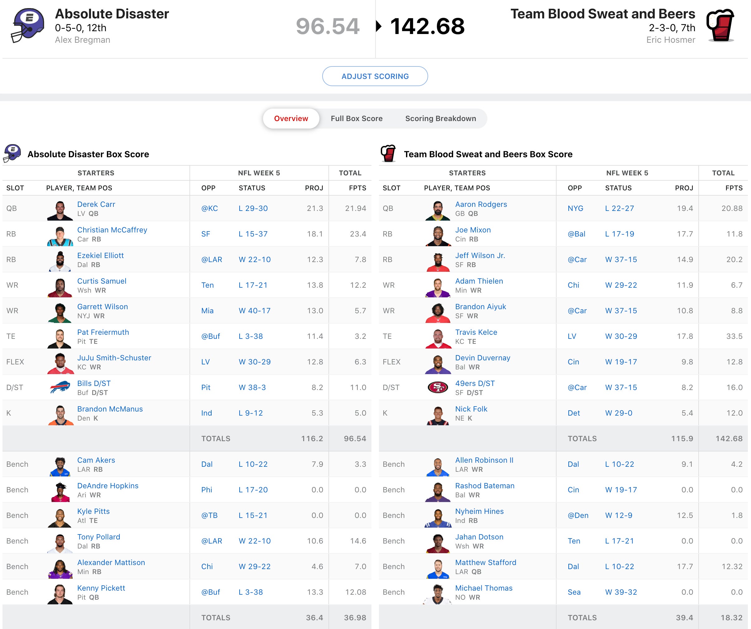 Bregman's move to trade for 4 RBs and only start 2 of them was bizzare. Relying on JuJu Smith-Schuster doesn't appear to be a winning formula in 2022 and Christian McCaffrey can only do so much to help. Meanwhile, Hosmer is starting to cook with his QB rotation of Aaron Rodgers and Matthew Stafford and his $100 waiver wire pickup of Jeff Wilson Jr. actually paying dividends. Oh yeah and he got 4 TDs on Monday Night from Travis Kelce.