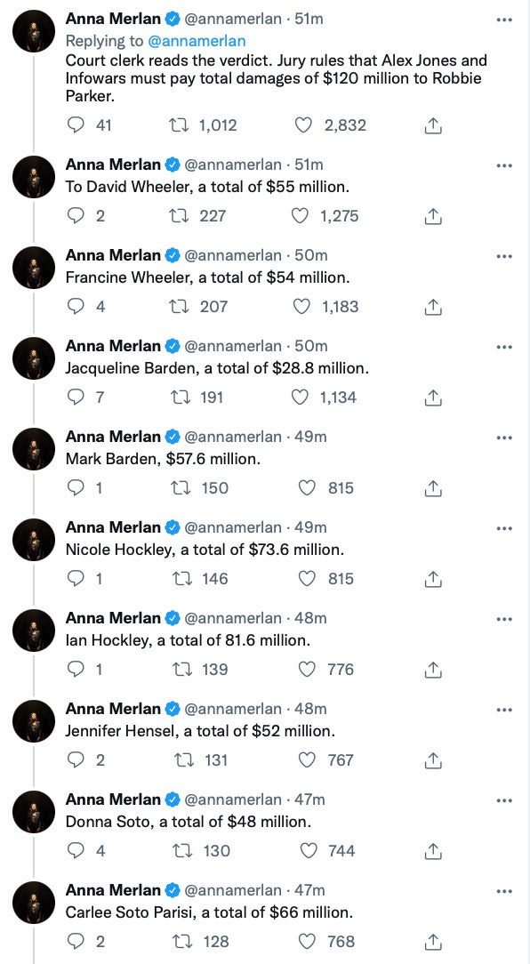 All told, the jury decided he should pay a total of $965M for his false claims about the Sandy Hook Elementary School shooting being a hoax. I don't think any amount will ever be enough for what they had to deal with: