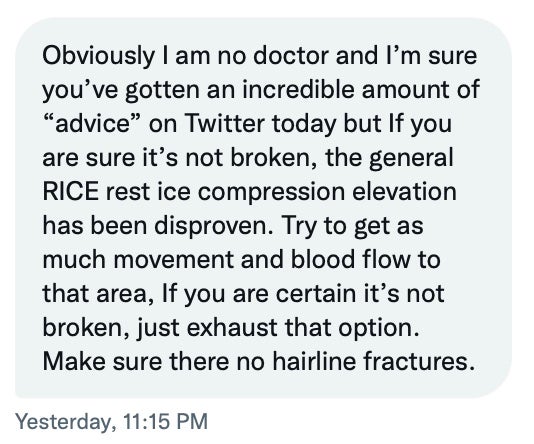 So for the last day or so, people have been giving me advice. And what have I learned from this Twitter doctors? Nothing. Absolutely nothing. After receiving tweets from all corners of the internet in response to my very bruised foot and ankle, I am significantly more confused, and far less confident that I know how to deal with this situation.