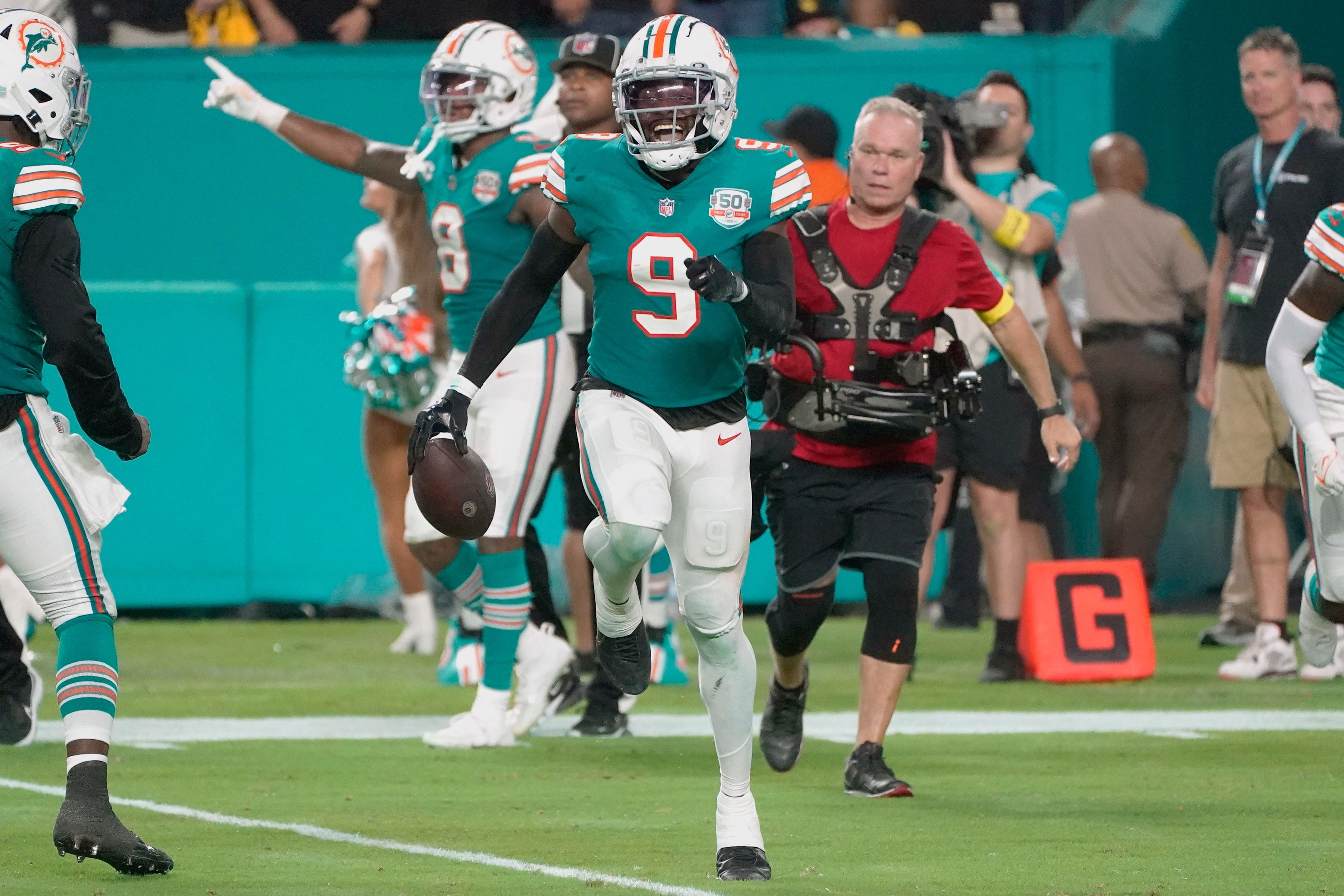 With the Dolphins' offense remaining in a shell. The Steelers went into the fourth quarter down six in a game that the Dolphins should have been able to put away. The Steelers were driving to take the lead late in the game, as they got into the red zone before a pair of penalties pushed the ball back to the Miami 30. Looking to get a first down, Kenny Pickett was picked off by Javon Holiday, who returned the ball to midfield, where the Dolphins just needed a first down to end the game.