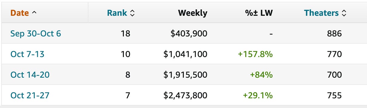 The craziest part is, word of mouth is really giving this flick legs. As the data from Box Office Mojo reveals, Terrifer 2's box office performance has actually improved despite releasing in 100 fewer theaters from its opening weekend: