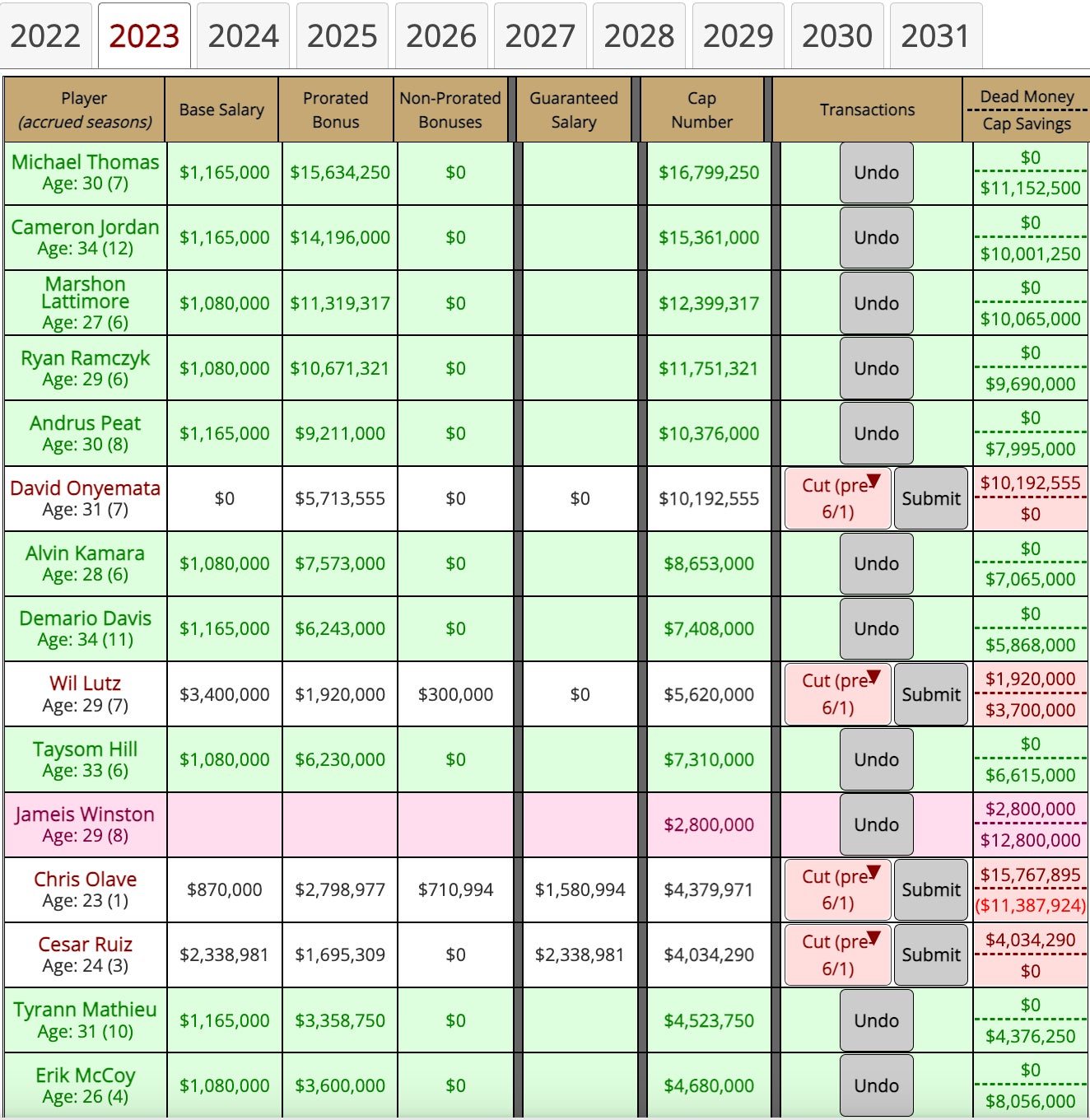 I had to restructure the contracts of TEN current players, and opted to release QB Jameis Winston with a post-June 1 designation to shave off another $12.8 million. That's a pretty dandy job if I may say so myself to free up $38.3 million in 2023 cap room. Kicking the can down the road to that degree only leaves a little over $10 million of space for 2024, though.