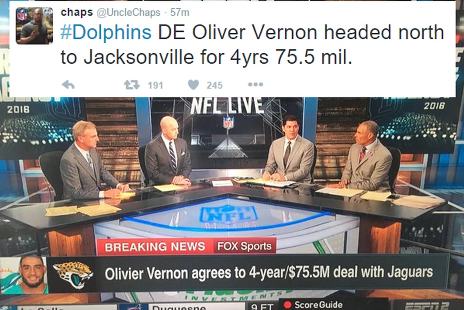 This is objectively funny, and the people who fell for it (ESPN) are objectively morons. It's really that simple. There's probably someone out there who would argue, "Imagine being Olivier Vernon's family, and you're just sitting at home, when all the sudden you think you're moving to Jacksonville. That could be stressful!" or something along those dumb lines.
