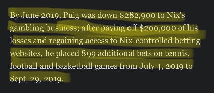 The biggest takeaway is that it's against the law and you should never gamble illegally. Second biggest takeaway is that Puig has a very itchy trigger finger on the parlay cards. Just absurd volume by all measures and cultural standards to register 899 wagers in less than 3 months. At that level you can't even refresh box scores much less bootleg a VPN on the clubhouse wifi.