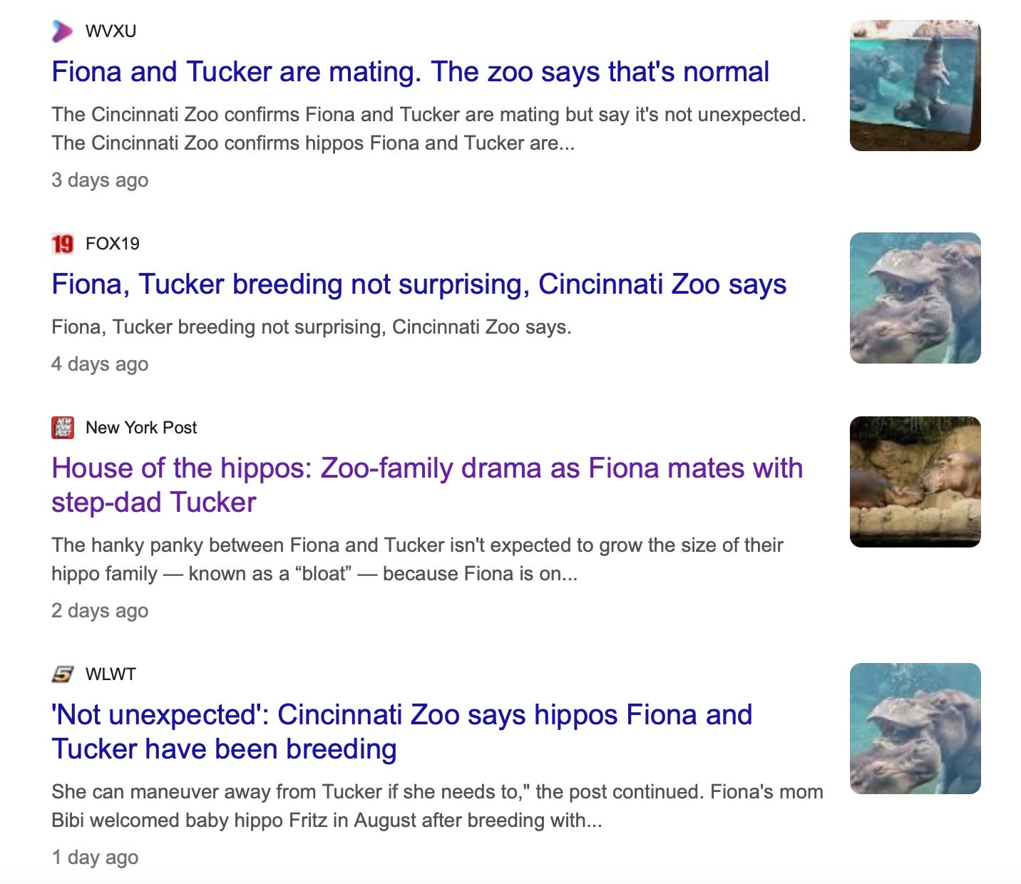 Cincinnati Enquirer - "Considering the fact that we are a family of hippos, which is known as a bloat, it is to be expected that my daughter would be having sex with her step-father. From what I have heard, step-father/step-daughter relationships are becoming more popular amongst humans as well. Some people get off on that sort of thing. But I would be lying if I said it wasn't a bit awkward. I still have to see Tucker's big beautiful ass every day. There will always be a part of me that is jealous that Fiona is the one who gets to enjoy the ass. However, in the end, we're literally hippos, so I will get over it. Now watch me eat this pumpkin. - Fiona, Hippo