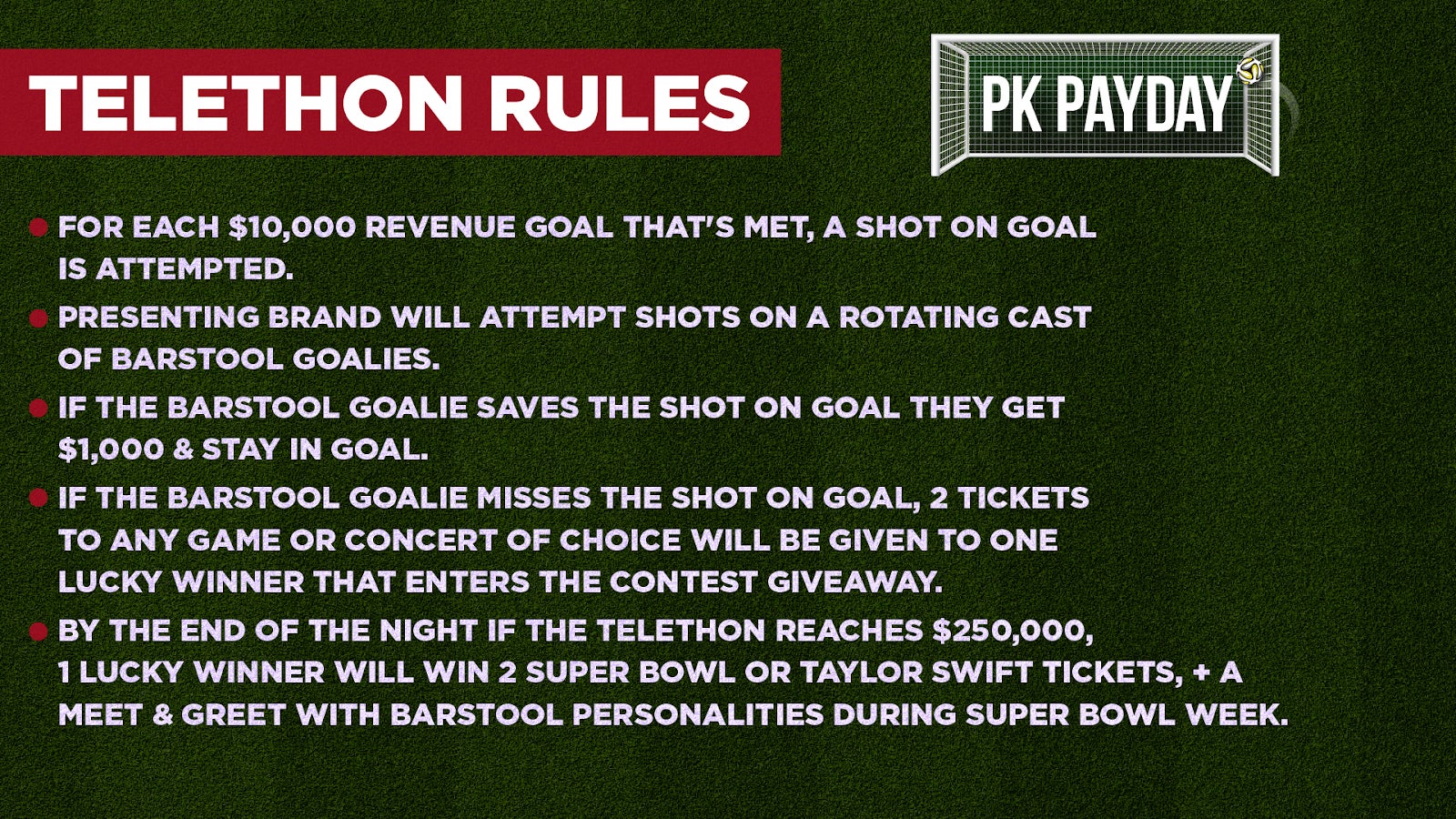 So basically for every $10,000 worth of merch we sell, the presenting brand at that time will get a shot on goal with a Barstool employee in net. If they score, 2 tickets to any game or concert of choice will go to a lucky Stoolie who enters the contest. If the goalie saves it, they get $1,000 and the chance to keep saving shots and earning money until they let one by. If we hit our goal of $250,000 by night's end then one random contest winner gets either 2 Super Bowl tickets OR Taylor Swift tickets. Plus a meet and greet with Barstool people during Super Bowl Week.